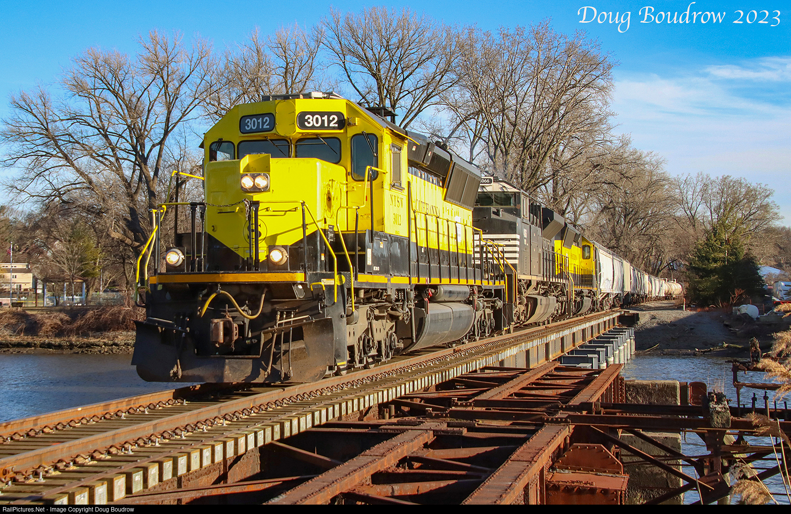 | New York, Susquehanna and Western SU-99 is seen crossing the Hackensack River just after departing Bogota, NJ headed for Binghamton, NY. |