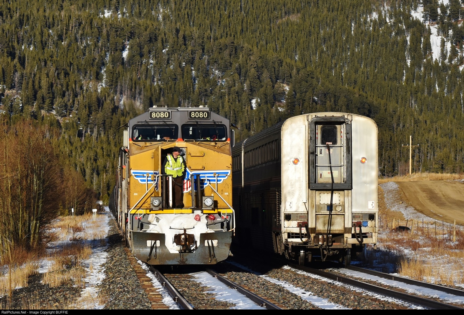 A crewman from UP 8080 does a visual check of the Winter Park Express Ski Train as it runs past the siding at Tolland, Colorado.