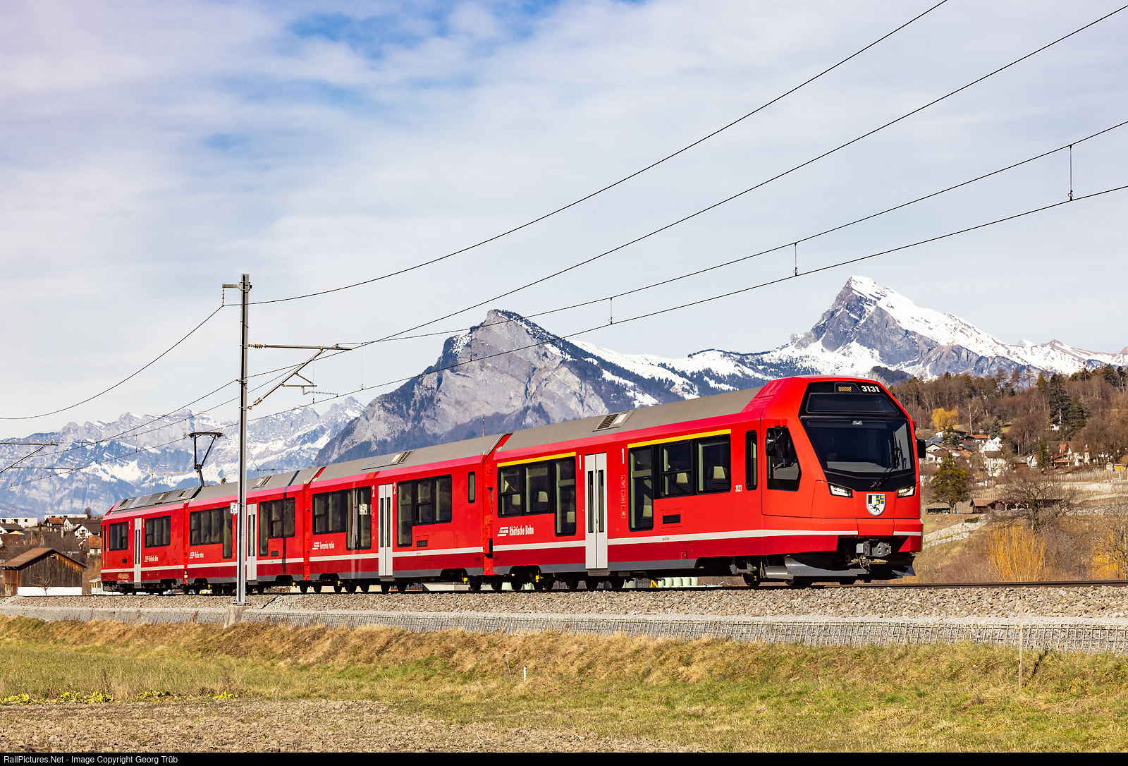 | "Capricorn" ABe 4/16 # 3131 of the Rhaetian Railway is running the S 1 service 1510 from Rhäzüns via Chur-Landquart to Schiers, between Malans and Grüsch, with Churfirsten, Gonzen and Gauschla in the background. |