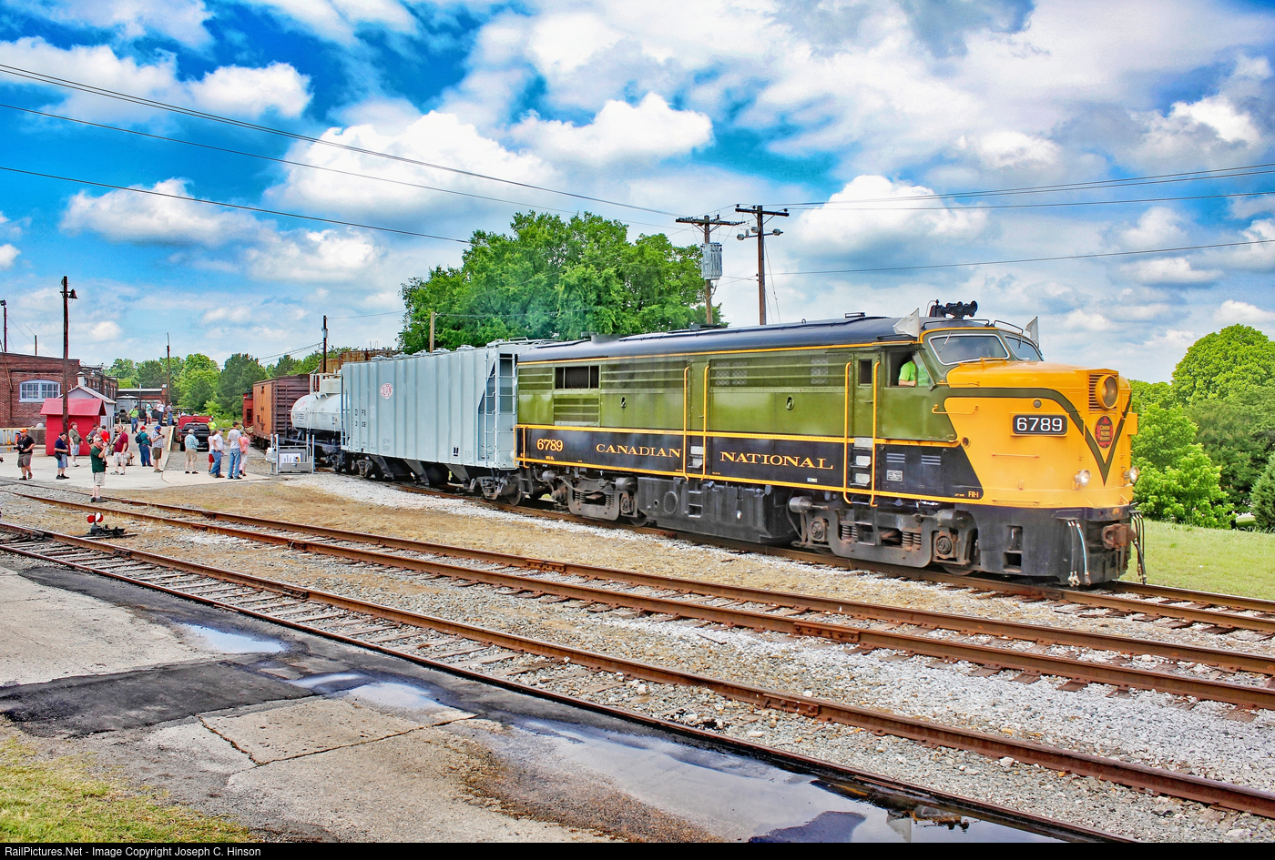 | Canadian National FPA4 #6789 brings a short train past a makeshift photo line in 2014 at the Streamliners at Spencer event. CN #6789 is an FPA4 built for Candian National in 1959 by the American Locomotive Company. |
