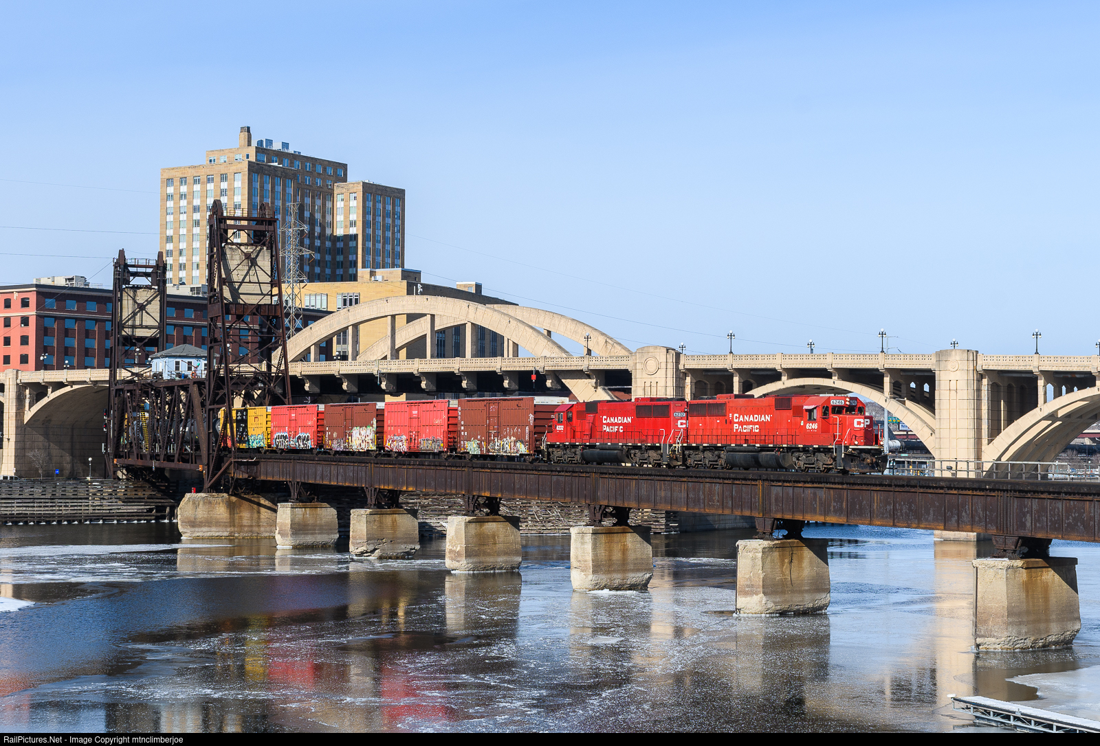 After getting the light from the UP dispatcher, Canadian Pacific local H37 slowly rolls through downtown Saint Paul, Minnesota and heads across the Mississippi River on the Roberts Street Lift Bridge behind a pair of SD60's. The lift bridge, built in 1913, features a Pratt Through Truss vertical lift span that is approached by eight deck girder spans on the south end. UP is currently in the process of submitting applications and developing plans for the replacement of the structure.
