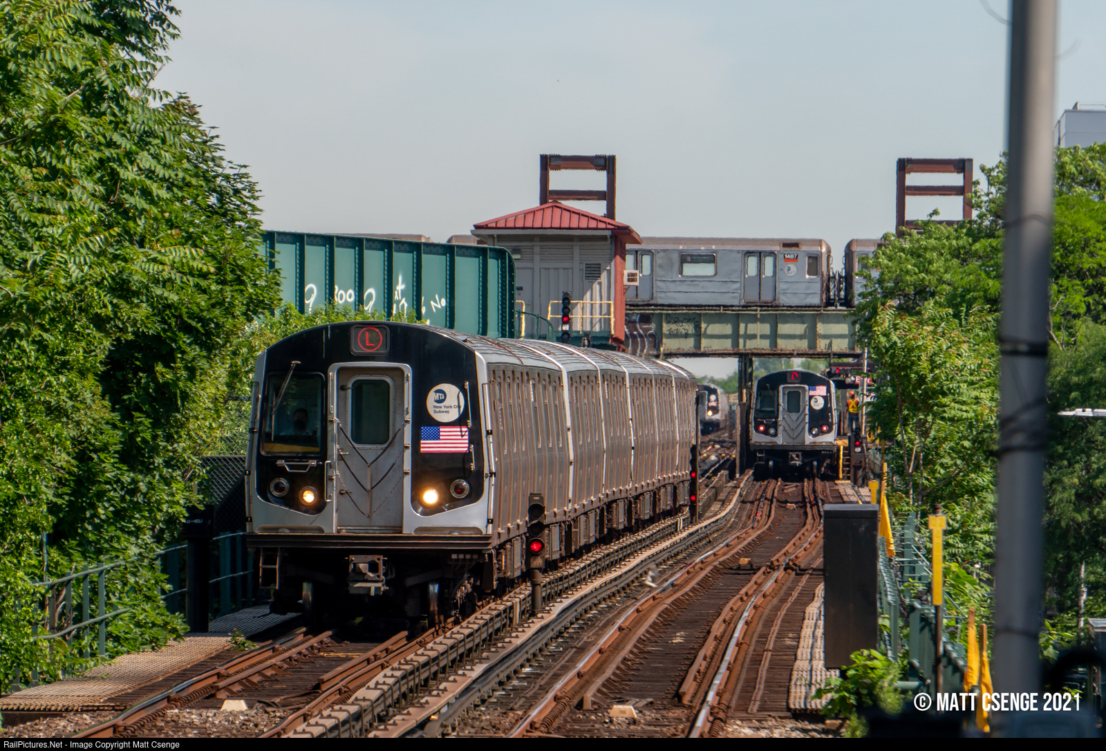 Three L's. A New Lots Ave-bound 3 train (Kawasaki R62, 1983-1985) is seen flying over Livonia Ave station, where three L trains can be seen below - two R143s (Kawasaki, 2001-2003) and one R160A (Alstom, 2005-2010). The close headways of the L trains are due to the Communications-Based Train Control (CBTC) and Automatic Train Operation (ATO) systems installed on the line.