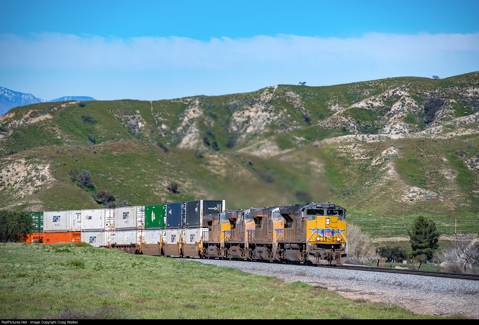 Climbing up and over Beaumont Hill, Union Pacific UPS Expedited Intermodal train ZLAMQ-19 makes its way from Los Angeles to Mesquite TX. UP SDSD70ACe 8989 is teamed with other diesels (ES44ACs 2554 and 5492, and AC4400CW 7261, along with mid-train DPUs AC4400CW 6494 and SD70ACe 8703) to defy gravity in moving this train to the 2612-foot (796.75 meters) altitude, from which it will head downhill into the lower Mojave Desert and, at Niland, to well below sea-level - 141-feet below sea level (-42.97 meters)! (San Timoteo Canyon, California – February 19, 2023)