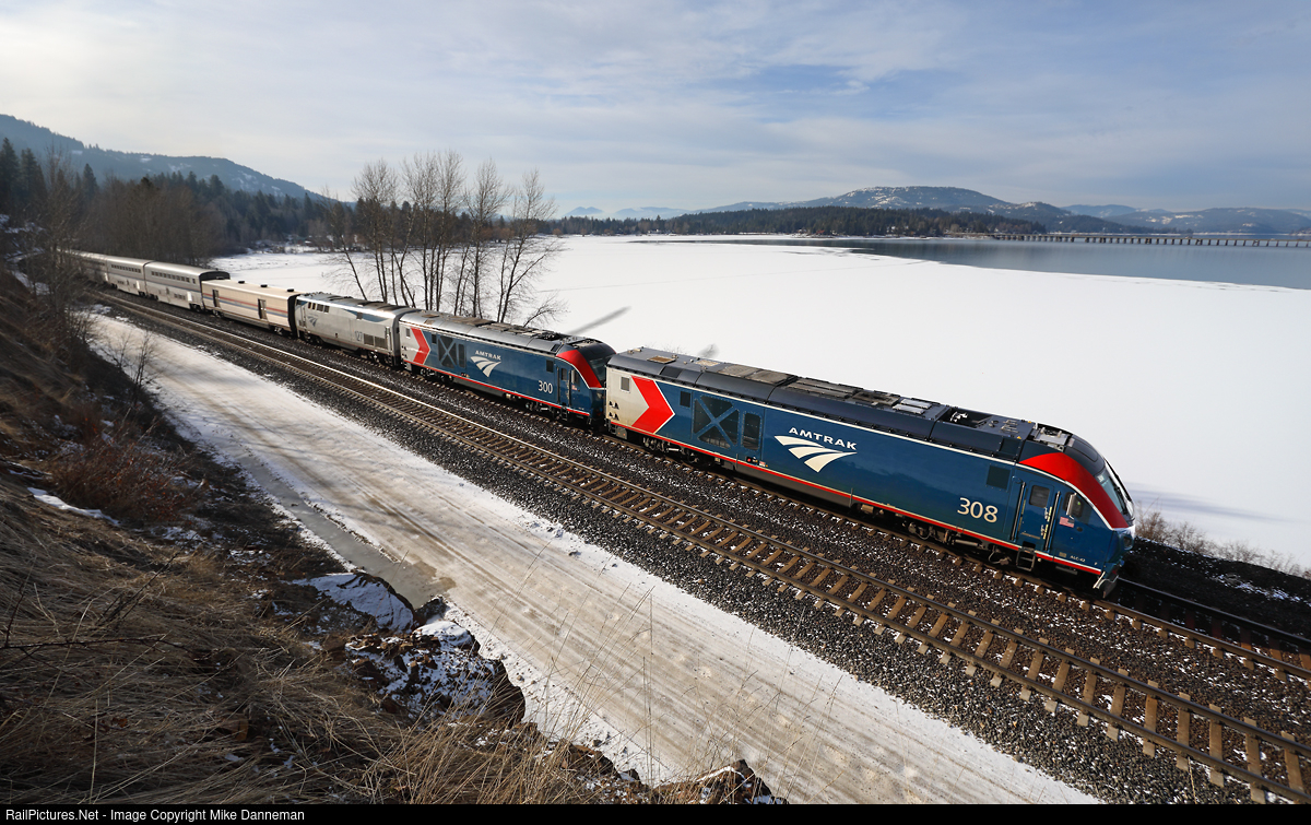 Normally arriving at Sandpoint, Idaho, at 2:20 a.m., Amtrak’s eastbound Empire Builder scurries through Algoma approaching Sandpoint a bit off the advertised at 10:10 a.m. on February 2, 2023. Amtrak ALC-42 Charger Nos. 308 and 300, along with GE P42DC No. 127, power the eastbound train along the frozen and snow-covered shore of Lake Pend Oreille.
