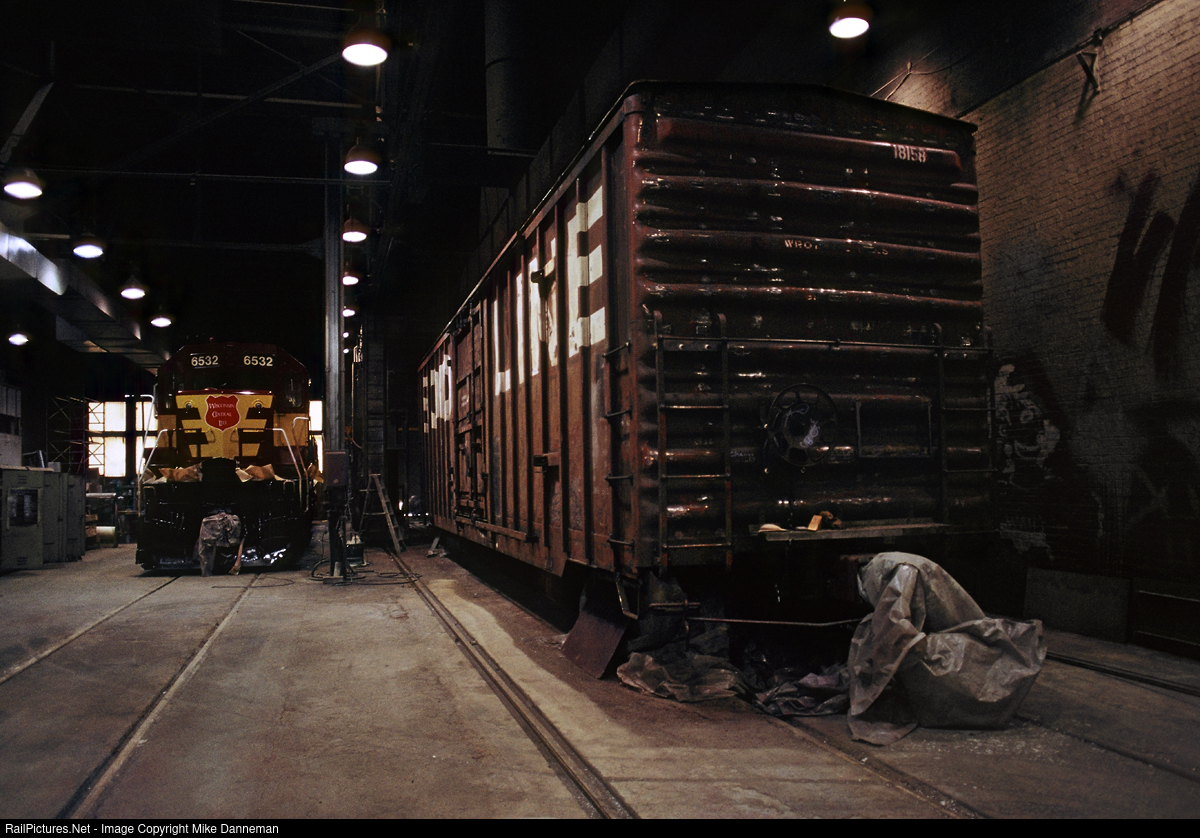 Inside Wisconsin Central’s car shop at North Fond du Lac, Wisconsin, is a Soo Line boxcar that is being prepped for WC paint, along with freshly-painted EMD SD45 No. 6532 getting some finishing touches. This former Soo facility aptly called “Shops Yard” was extensively used by WC as its major car and locomotive shop.