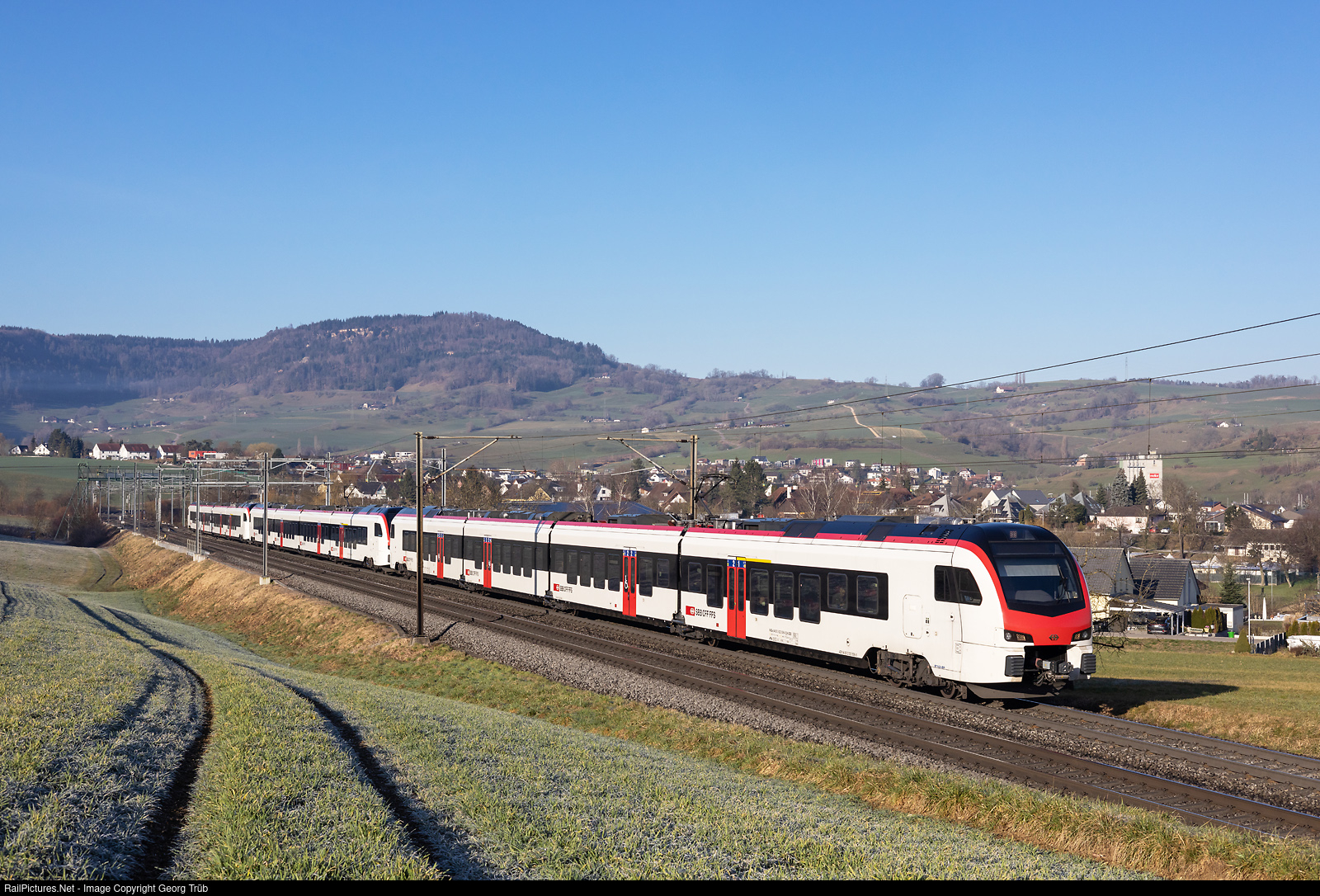 "Flirt Mouette" (seagull) RABe 523 # 506, # 507 and # 511 of the SBB in multiple control are running the Interregio 2063 of the line IR 36 from Basel via Rheinfelden-Frick-Brugg AG-Baden-Dietikon-Zürich to Zürich Airport, between Frick and Hornussen.
