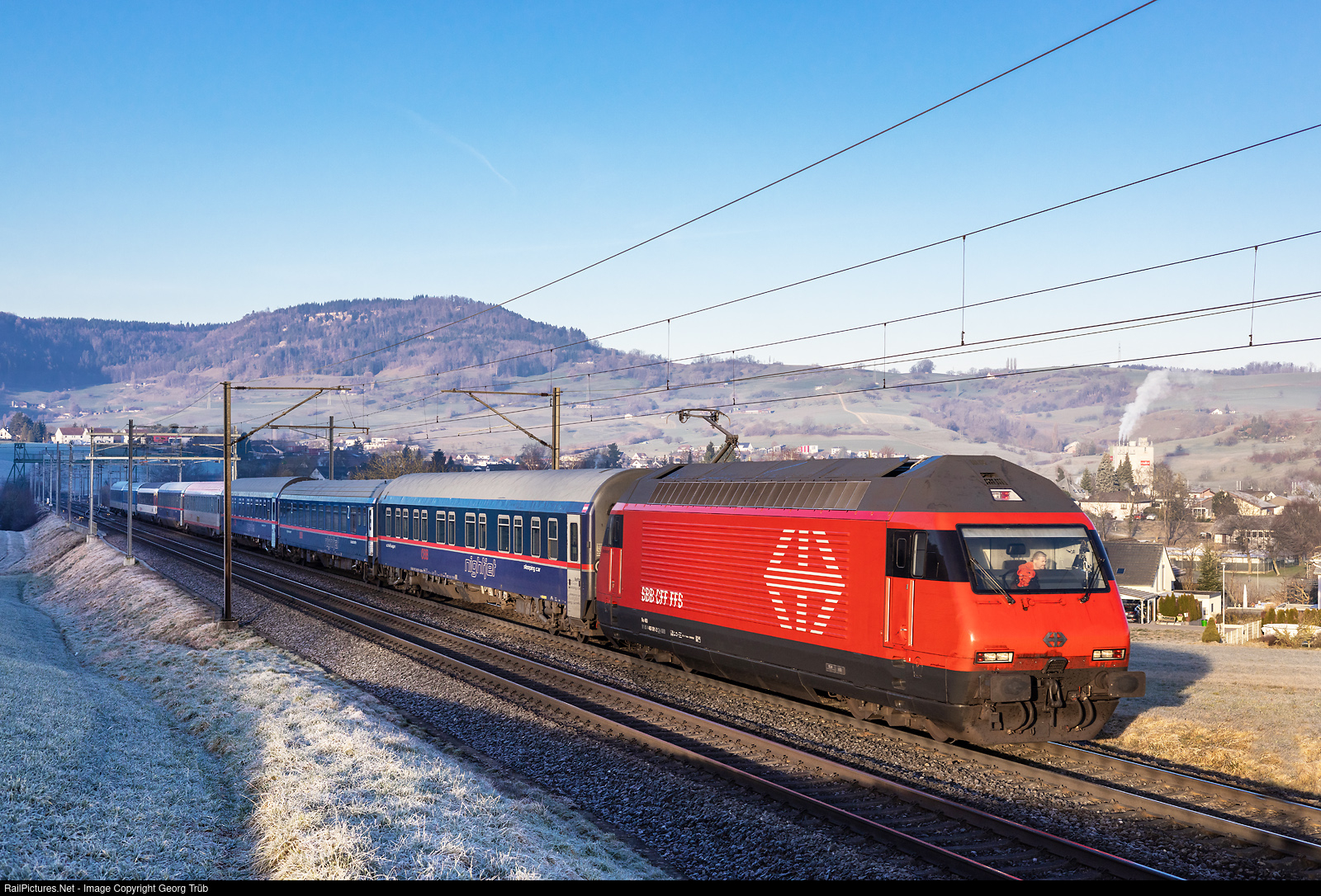 | Re 460 # 091 of the SBB is pulling the NightJet 458 from Praha via Dresden-Leipzig-Frankfurt-Basel to Zürich, on the Bözberg north ramp between Frick and Hornussen. The train has cars from Berlin as well in front, coupled in Leipzig. The cars of the Czech CD from Praha are in the rear. |