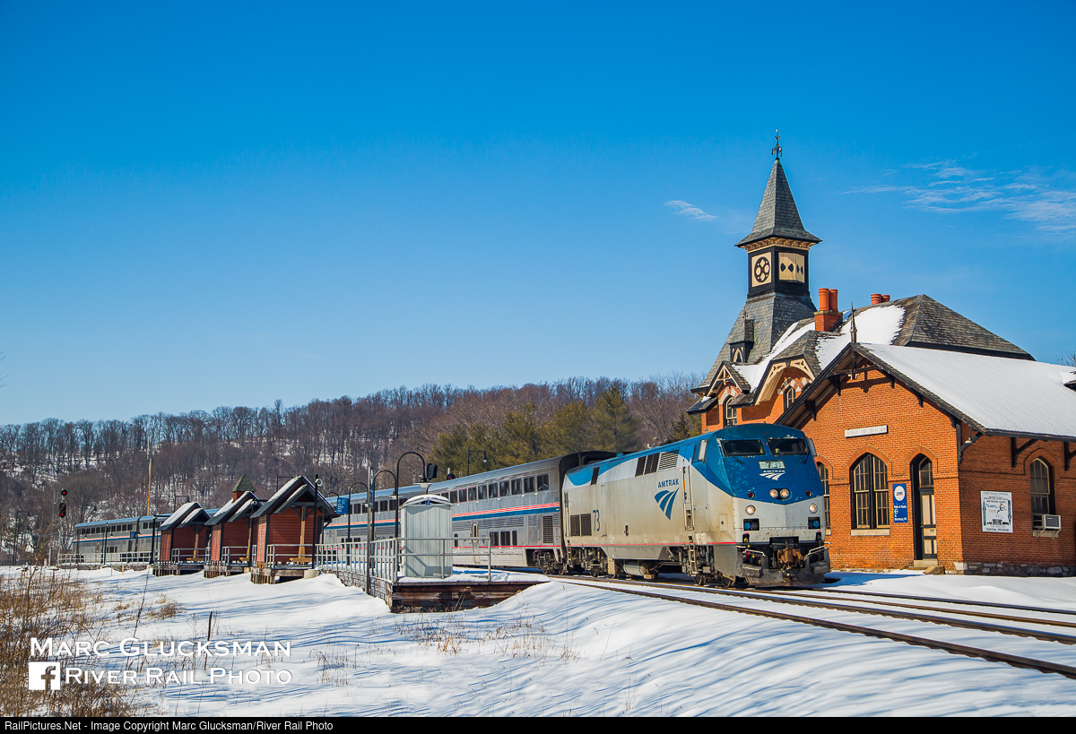 Snow On The Rocks. A nice coating of snow covers the ground as well as the 1873 B&O Railroad E. Francis Baldwin designed Gothic Revival style depot at Point Of Rocks, Maryland as Amtrak Train 30 (Capitol Limited) passes with AMTK 73 (P42DC) leading seasonal shortened consist on Sunday, February 22, 2015. The station building is now only used by CSX as an office, and while Amtrak does not stop here, on weekdays MARC commuter trains stop at the platform. The train is now 42 miles from its terminal in Washington DC after leaving Chicago, Illinois the previous night.
