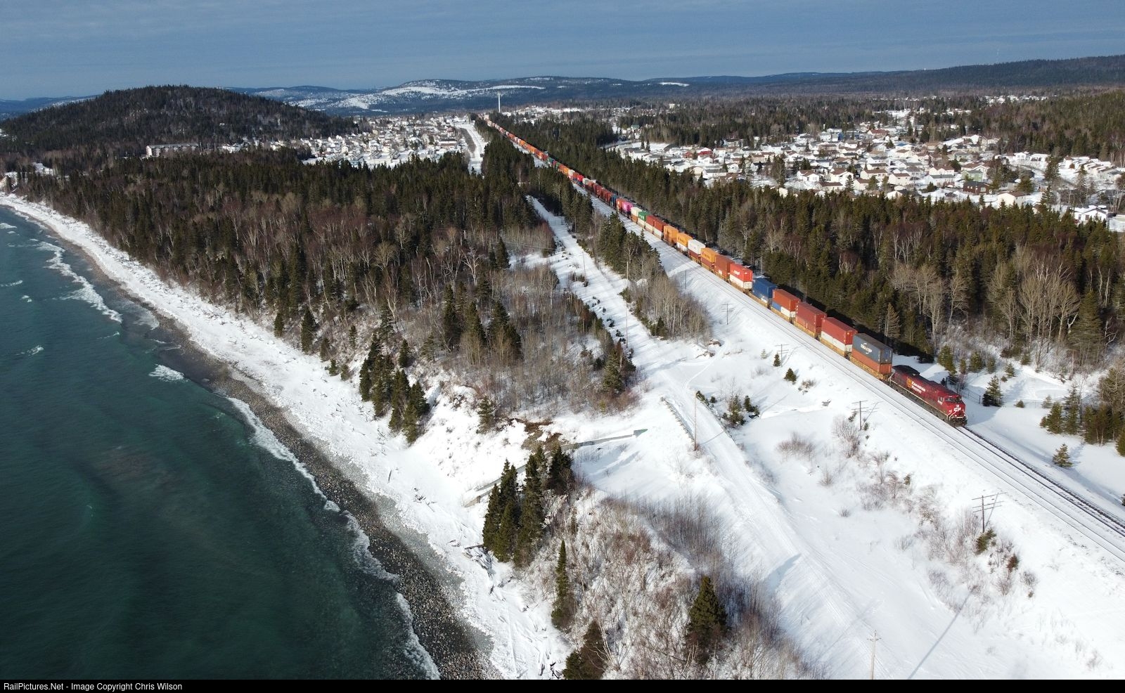 | Deltaport, BC to Vaughan, ON import containers stretch through the town of Marathon located along the shores of Lake Superior |