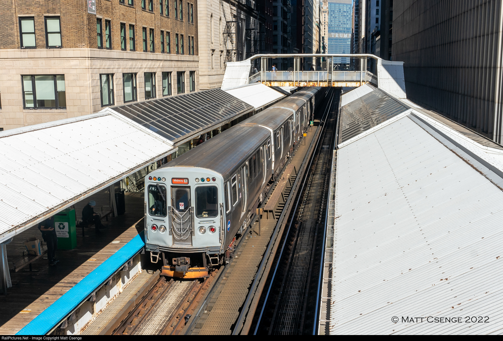 Chicago Transit Authority (CTA) 2600-Series car no. 2705 (Budd, 1981-1987) is the lead motor on an Orange Line train to Midway, seen here entering Adams/Wabash Station. This station features two overhead pedestrian bridges, which are quite popular for photographers! |