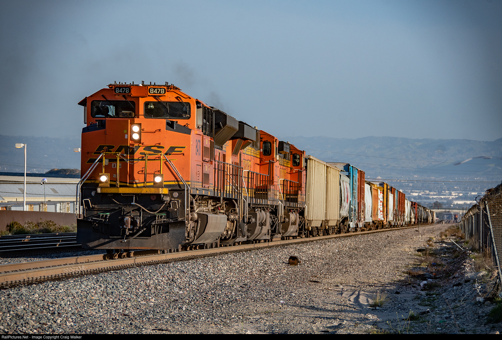 Climbing the grade out of San Bernardino as it heads for nearby Cajon Pass is BNSF High Priority Freight train H-WCLBAR1-19F – known as the "WickleBar" by crews. This day's WCLBAR is powered by SD70ACe 8478, AC4400CWT2 5722 and Dash 9-44CW 5231 – the same power that delivered the westbound counterpart, the HBARWCL, from Barstow to Union Pacific's West Colton Yard earlier in the day. This eastbound train, heading from West Colton to Barstow, has 53 cars, with 21 of them loads, and stretches for 3,489-feet (1063.45 meters), with a weight of 3,888 tons. Bet, back to the second locomotive … An AC4400CWT2? BNSF calls these AC4400EVs, but to save even more space they are listed as AC44EVs in their computer system. These are part of the experimental GEVOs built by General Electric for testing on the railroads. BNSF received 30 (5718-5747), UP 5 (5695-5699), and NS 15 (9900-9914, although most were delivered in the number series 7500-7514). Interestingly, the model designation on the side sill of BNSF 5722 is "AC4400CW" but, both internally and externally, it is an ES44AC. Confused? You ought to be! (San Bernardino, California – February 19, 2023)