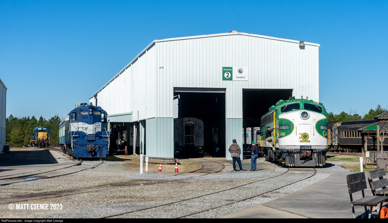 Southern Railway E8A no. 6901 (EMD, 1951), Georgia Railroad GP7 no. 1026 (EMD, 1950), and CSX Transportation SD45-2 (EMD, 1974) are seen outside the display halls of the Southeastern Railway Museum on a rather warm February day.