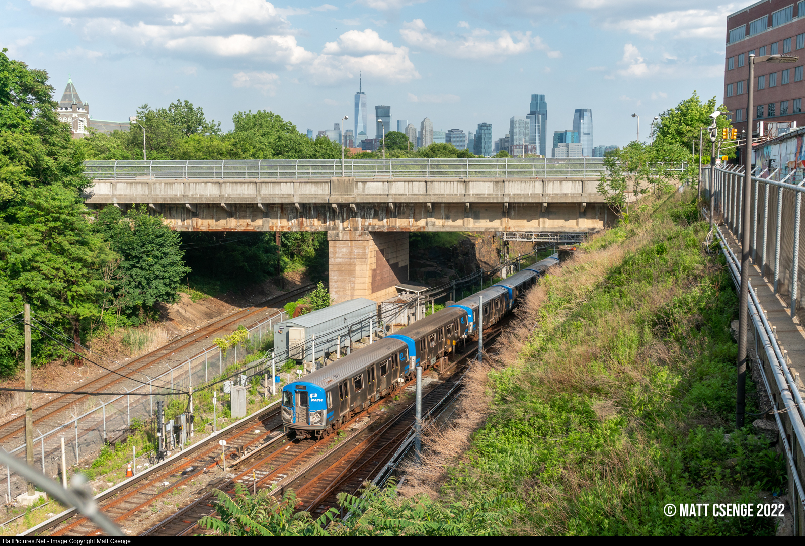 A Journal Square-bound PATH train of PA-5 cars (Kawasaki, 2008-2012) is seen approaching its final station, far from Manhattan where it started 8 stops ago. From this vantage point the skylines of Lower Manhattan and Jersey City blend together above the Summit Ave overpass. |