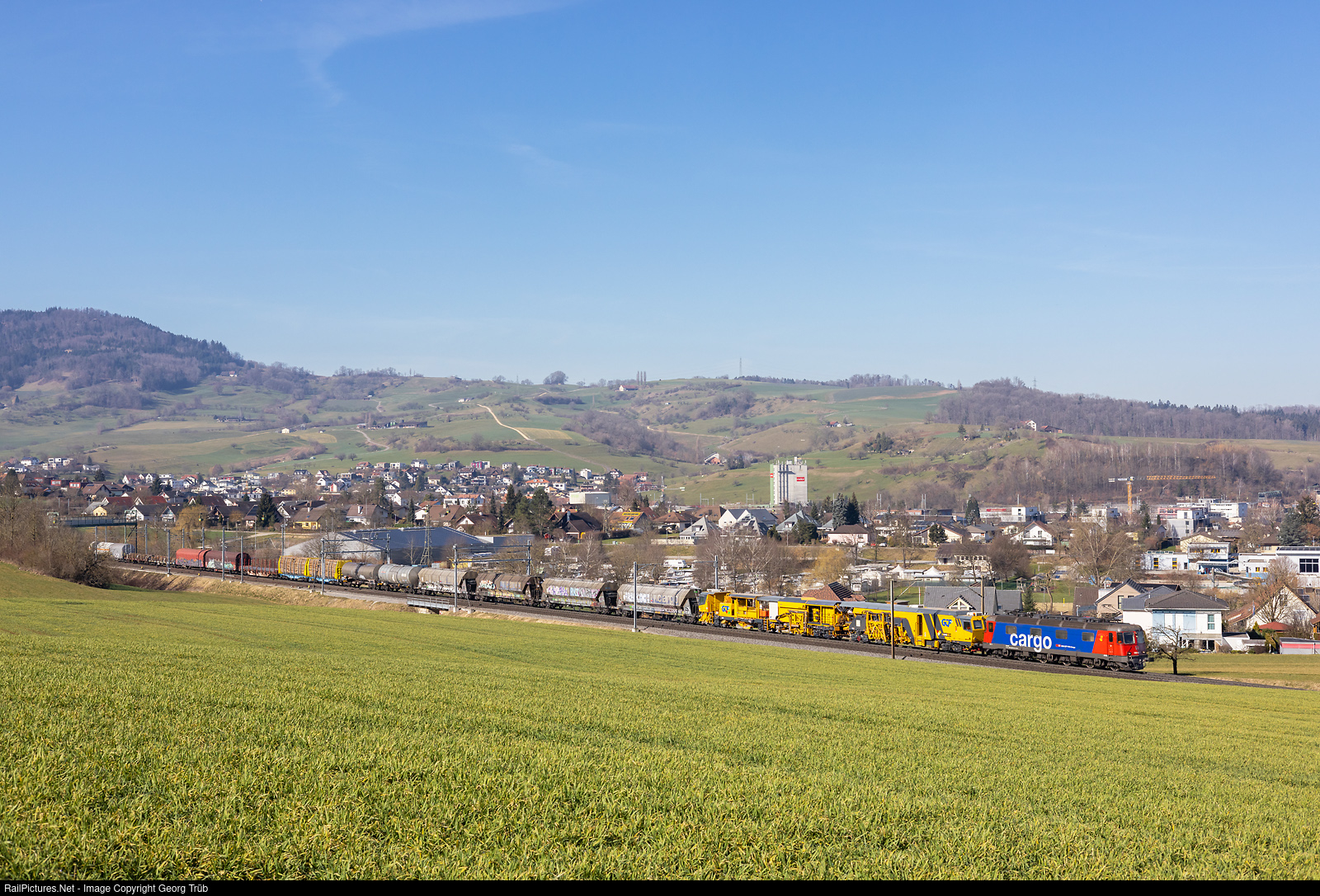 | Re 620 # 087 (Re 6/6 # 11687) "Bischofszell" is pulling the freight train 60125 from Basel shunting yard to the RBL (Limmattal shunting yard), between Frick and Hornussen. Behind the locomotive is a large high-performance universal, double head, continuous action, tamping machine "Matisa B 66 UC-D" of the italian company "Generale Construzione Ferroviare S.p.a" (GCF). |