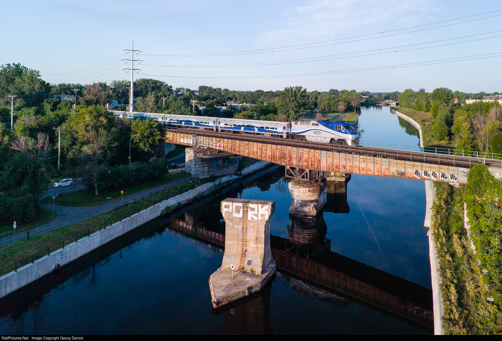 Towards the end of their operating career, a set of Comet commuter cars is pulled by AMT F59PHI no. 1326 over the Lachine Canal on CP's Adirondack sub.