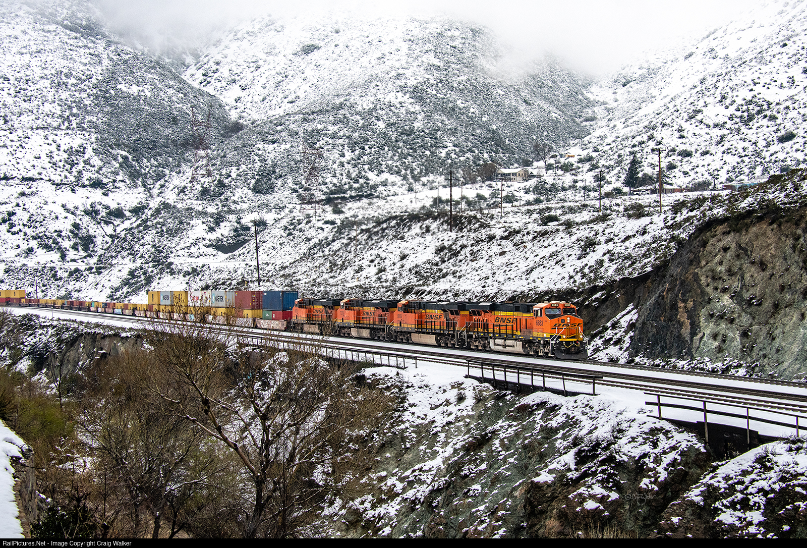 At 2618 feet, Cajon Pass' Blue Cut, is much lower than Cajon (near Sullivan's Curve) or Summit (obviously, since it sits at 3775-feet). It therefore rarely gets much snow. However, after three days of a cold arctic storm, and a particularly punishing third day, Blue Cut has a thicker than usual white coat. Grinding up the grade, eleven miles from Summit, is BNSF Railway's Long Beach CA-Pier T to Logistics Park Chicago IL Intermodal Stacks train, the S-LBTLPC1-25, steadily working its way uphill alongside a swiftly flowing Cajon Creek, behind BNSF ES44C4s 6883 and 6956, ES44DC 7279 and ES44C4 8278 up front, with BNSF Dash 9-44CW 5050 and ES44DC 7681 as the rear Distributed Power Units (DPU) – essentially remote-controlled helpers. (Cajon Pass, California – February 26, 2023)