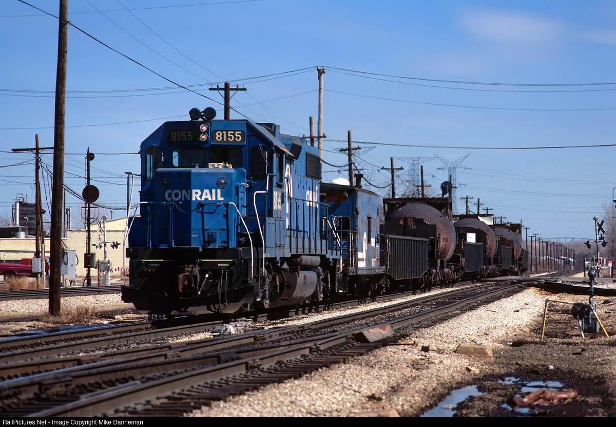 Hot bottles Conrail EMD GP38-2 No. 8155 powers a hot metal “bottle train” approaching the busy junction at Dolton, Illinois, on March 19, 1988. These trains shipped molten metal from blast furnaces in East Chicago to a steel plant in nearby Riverdale, utilizing a short section of the former Pennsylvania Railroad’s Panhandle line out of Dolton Junction.