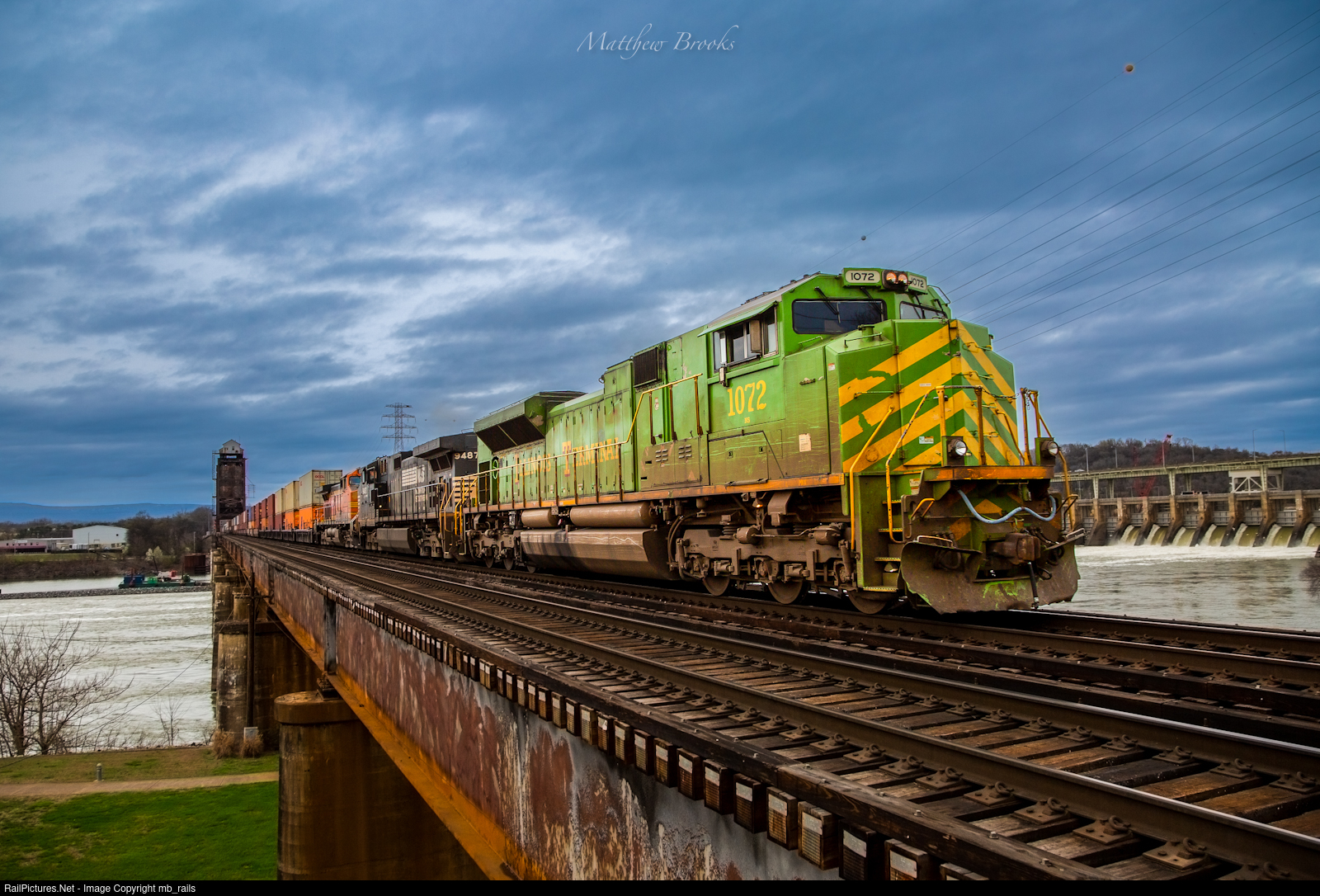 Norfolk Southern 1072 the Illinois Terminal Heritage Unit crosses Tenbridge on a warm February evening in Chattanooga, Tennessee.