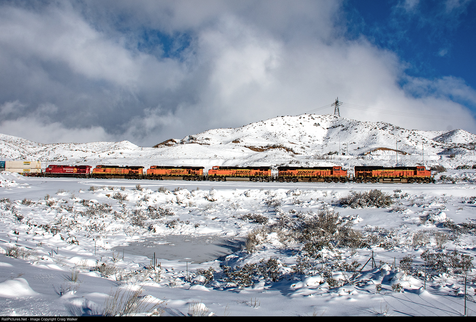 The summit of Cajon Pass, a spot the railroad inexplicably calls "Summit", sits 3,775-feet above sea level. The day after a massive snowstorm hit the area, dropping snow at elevations around 1,000-feet, BNSF Railway train Q-LACFTM1-25L has gotten to the top of the hill, and in the process found bright sunshine, unlike the rest of "the Pass" that is still experiencing snow flurries. This Guaranteed Service Intermodal train (94 loaded cars, weighing 6,508 tons and 8,951-feet in length) originated in Los Angeles CA and is bound for Fort Madison IA. Thanks to a storm-caused power outage at BNSF's Hobart Yard the night before, this train was already over four hours late departing LA. Engineer Mooney and conductor Davis will have no problems, though, the rest of the way to Barstow, where a new crew will take over. This train has a visitor from above the 49th Parallel as well, with BNSF ET44C4 3818 teamed with ES44C4s 7970 and 6827, ES44AC 5921, Dash 9-44CW 5297 and Canadian Pacific AC44C6M 8068 (CP calls these rebuilt AC4400CWs "AC4400CWM" and classes them as DRF-44, and this particular diesel is the former CP 9527). Curiously, the BNSF computer listed CP 8068 as a "GP38-2"! (Cajon Pass, California – February 26, 2023)