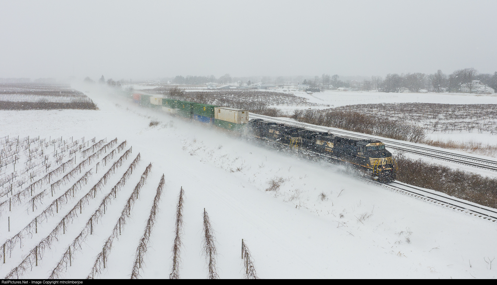 | As a lake effect storm blankets the region with another layer of fresh snow, Norfolk Southern intermodal train 22K forges ahead behind a pair of AC44C6M's. The train is about to cross Bort Road outside North East, Pennsylvania as it parallels the CSX mainline and heads east. |