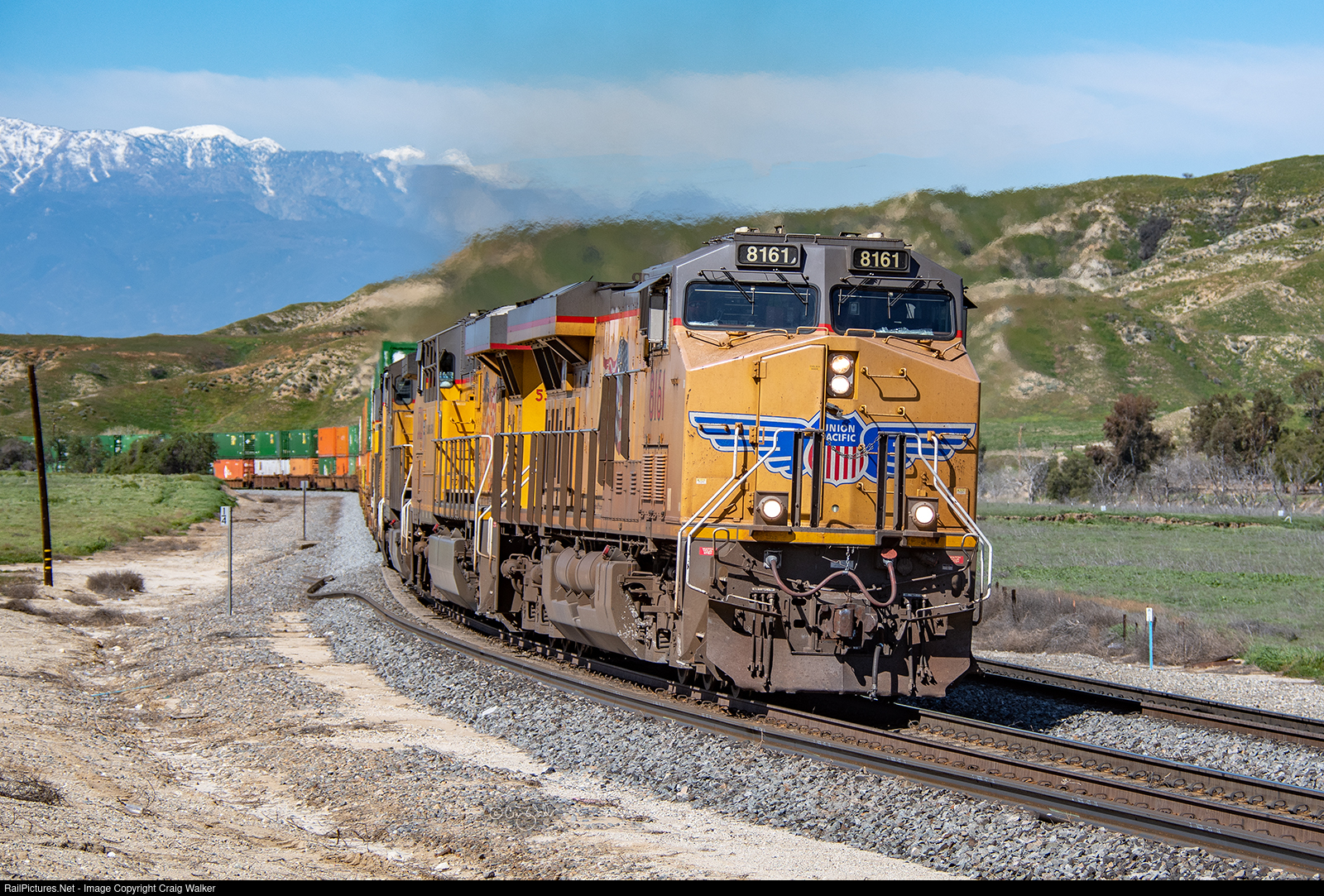 Leaning into a curve is Union Pacific train ZLAAI-19, a UPS Expedited Intermodal train making its way from Los Angeles CA to Atlanta GA. Climbing up southern California’s San Timoteo Canyon as it heads to the lower Mojave Desert, Arizona and beyond, are ES44AC 8161, ES44AC 5321, AC4400CW 6407, ES44AC 7708 and SD70ACe 8697. (San Timoteo Canyon, California – February 19, 2023)