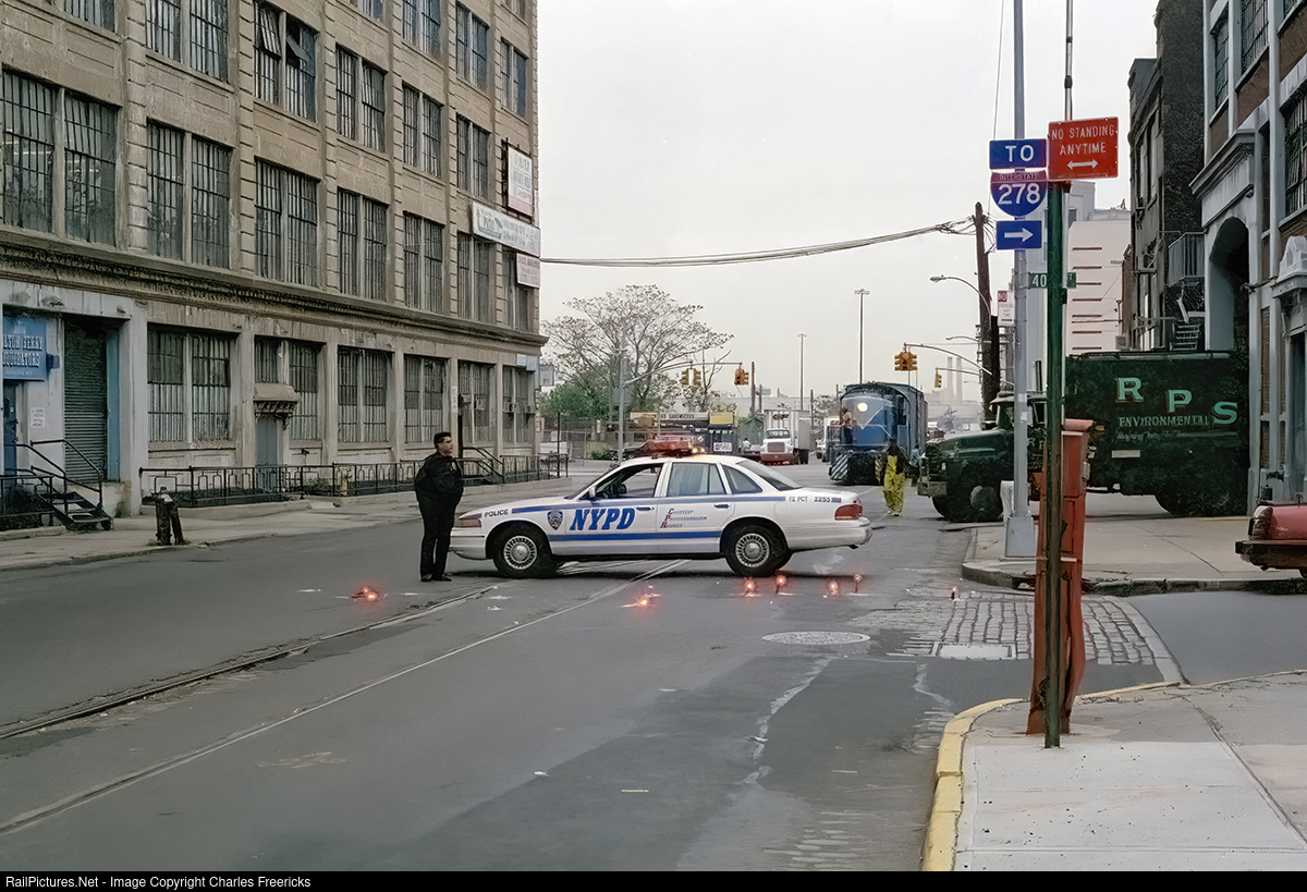 New York Cross Harbor Railroad S1 #25 street running on 2nd Avenue near Bush Terminal in Brooklyn New York on May 1, 1998, gets some protection from the city's finest as the crew tries to figure out their next step after derailing.