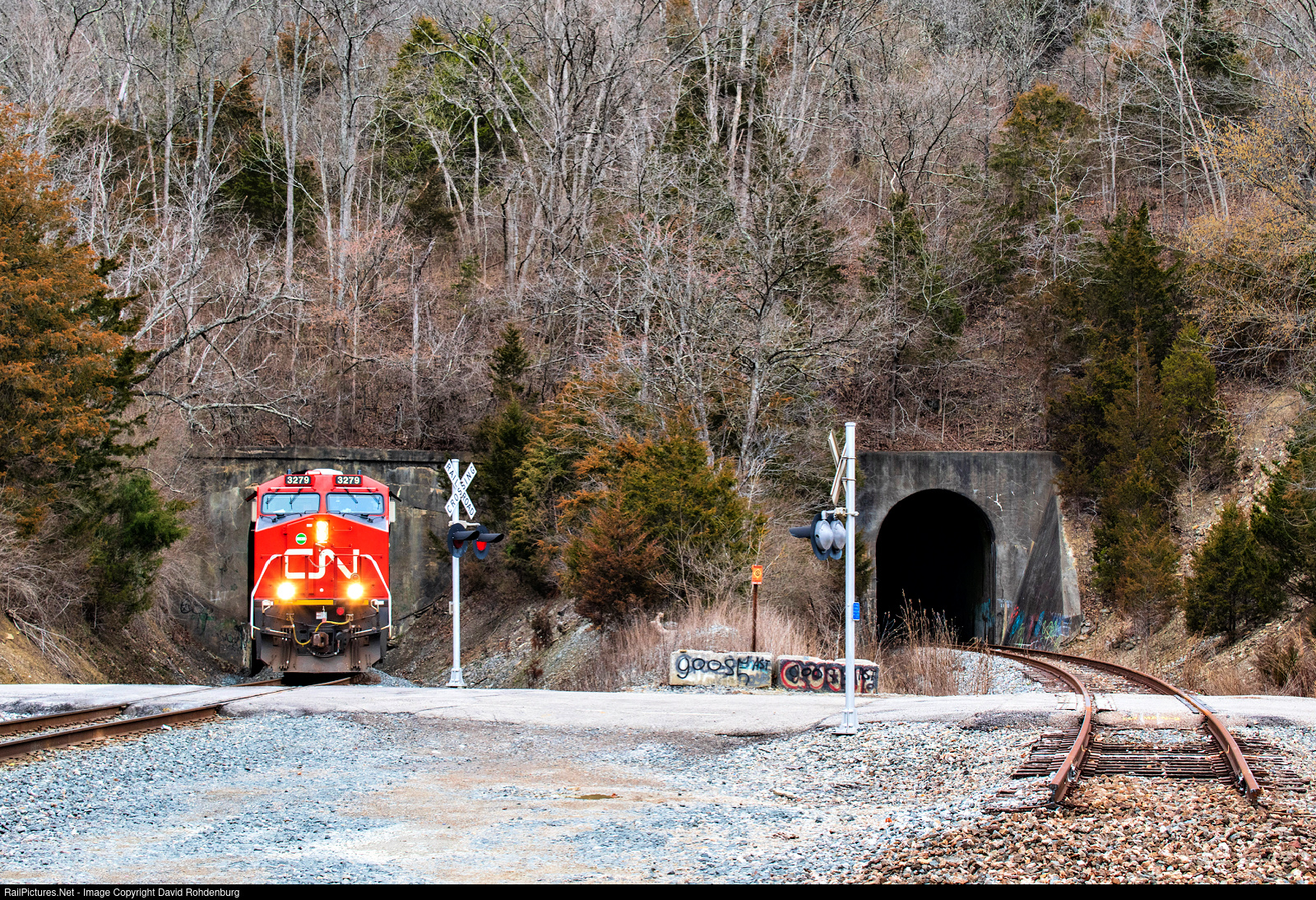 | CN GE ET44AC No. 3279 and another CN GE counterpart lead CSX bulk commodity (ethanol) train B637-27 southbound out of the Twin Tunnels at Lambs Ferry Road on the CC Subdivision. As you can see, CSX has recently removed the trackage of Main 2 into the other tunnel. The remaining single main is the former Main 1. |