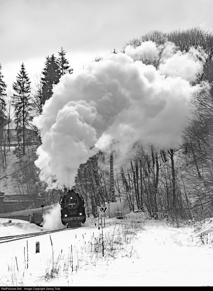 | The 2-8-2 mixed train steamlocomotive 41 # 1144 of the IGE "Werrabahn Eisenach" e. V. is leaving the 233 meter long Zella-Mehlis tunnel in a grade of 2.0 % and entering the station, with the passenger special of the IGE/ZRT from Meiningen via Arnstadt to Erfurt, and back via Eisenach-Bad Salzungen to Meiningen. |