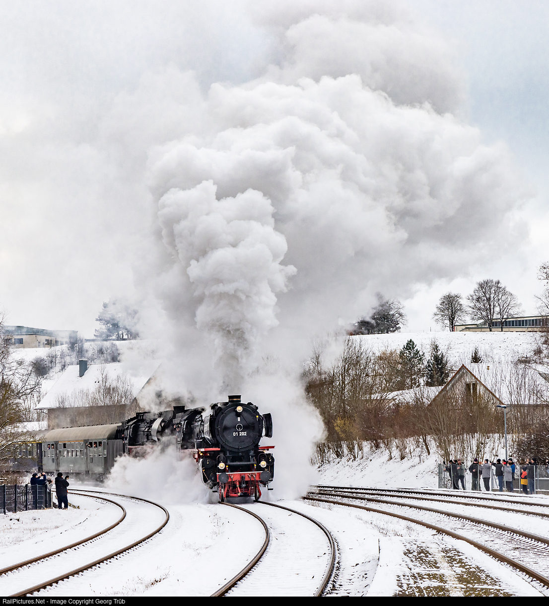 | 4-6-2 express train steamlocomotives 01 # 202 of the association "Pacific 01 202" from Lyss and the 01 # 519 of the Eisenbahnfreunde Zollernbahn (EFZ) from Rottweil are entering Kaufbeuren with the IGE/ZRT passenger special from Singen (Hohentwiel) via Friedrichshafen-Lindau-Immenstadt-Augsburg to Nürnberg. |