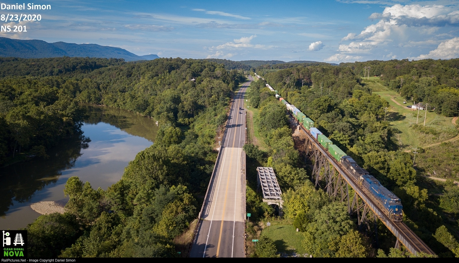 On home rails, the Norfolk & Western Railway heritage unit rolls over the trestle at Overall heading south down the NS Hagerstown District. US Highway 340 runs north/south through the center of the image and the Shenandoah River is visible to the left.