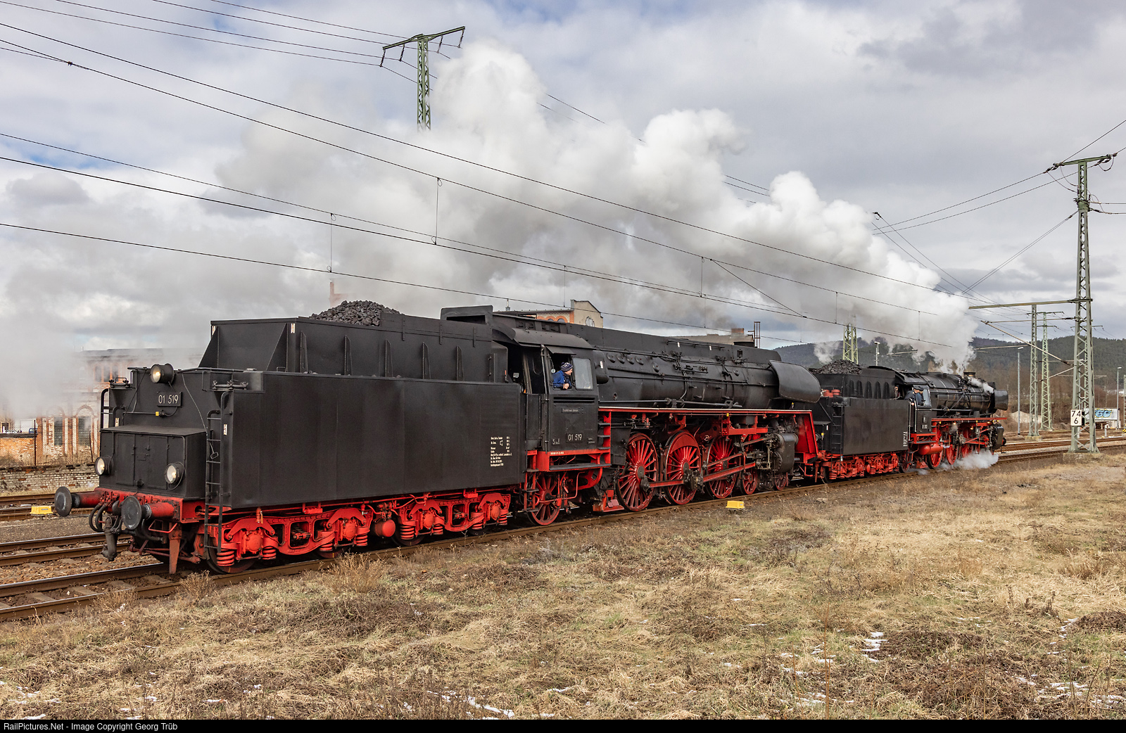 | The 4-6-2 express train steamlocomotives 01 # 202 (association "Pacific 01 202" in Lyss) and 01 # 519 (Eisenbahnfreunde Zollernbahn e.V., Rottweil) are running to the roundhouse in Saalfeld to take water and to turn (the 01 # 519) on the turntable. The former Deutsche Reichsbahn 01 # 519 was based here in Saalfeld from 1973 to 1982. Both locomotives pulled the IGE/ZRT Bahnreisen passenger special this day from Nürnberg via Bamberg-Probstzella-Saalfeld-Arnstadt-Oberhof to Meiningen. |