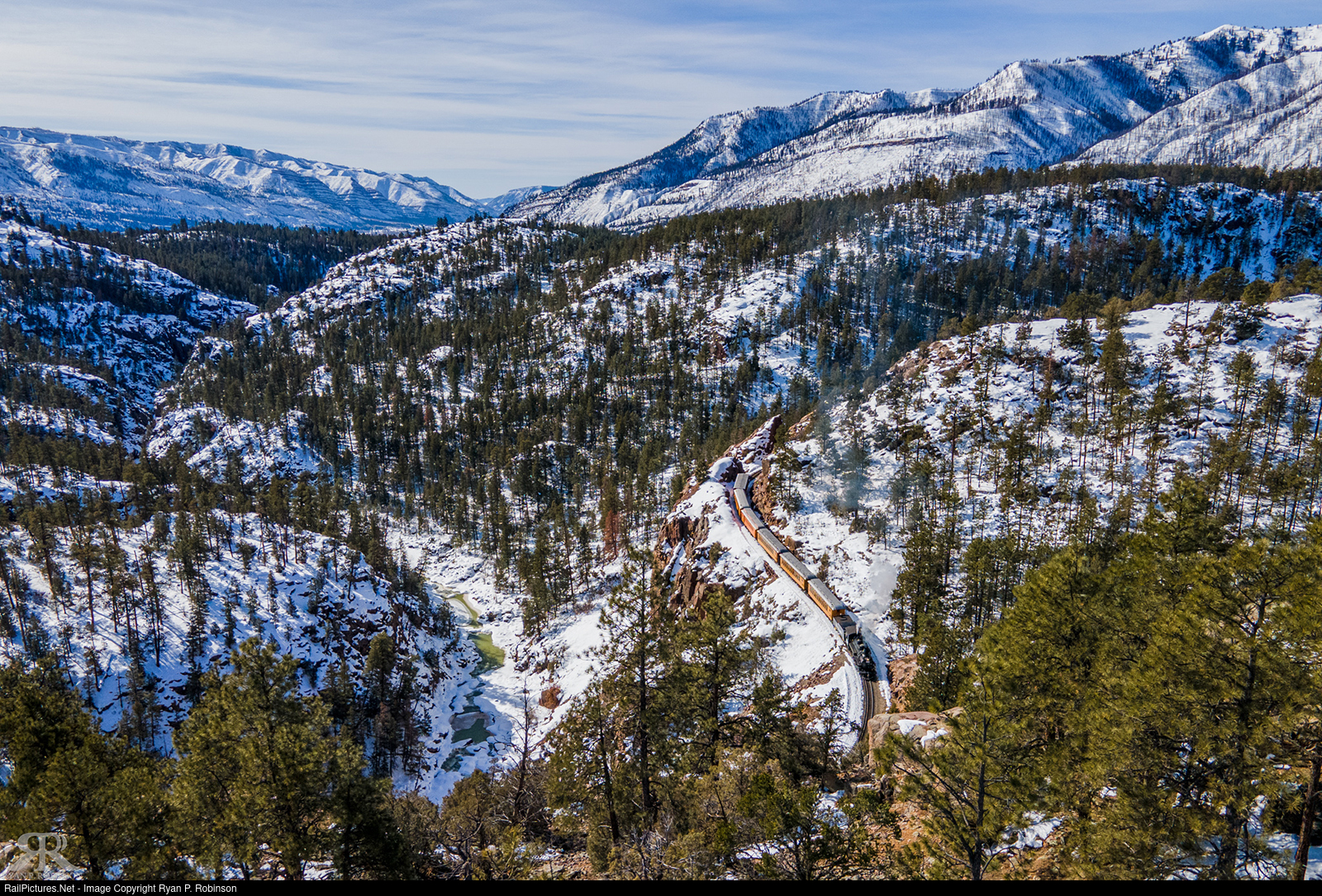 After a summer exploring angles of this line in the remote San Juans, I came to a simple conclusion for these high-angle shots: fly the drone, don't climb. This was an angle I scoped out over the summer, and was able to capture under the snow-blanketed winter landscape. This is about CW McCall height above the Animas River and Horseshoe Curve.