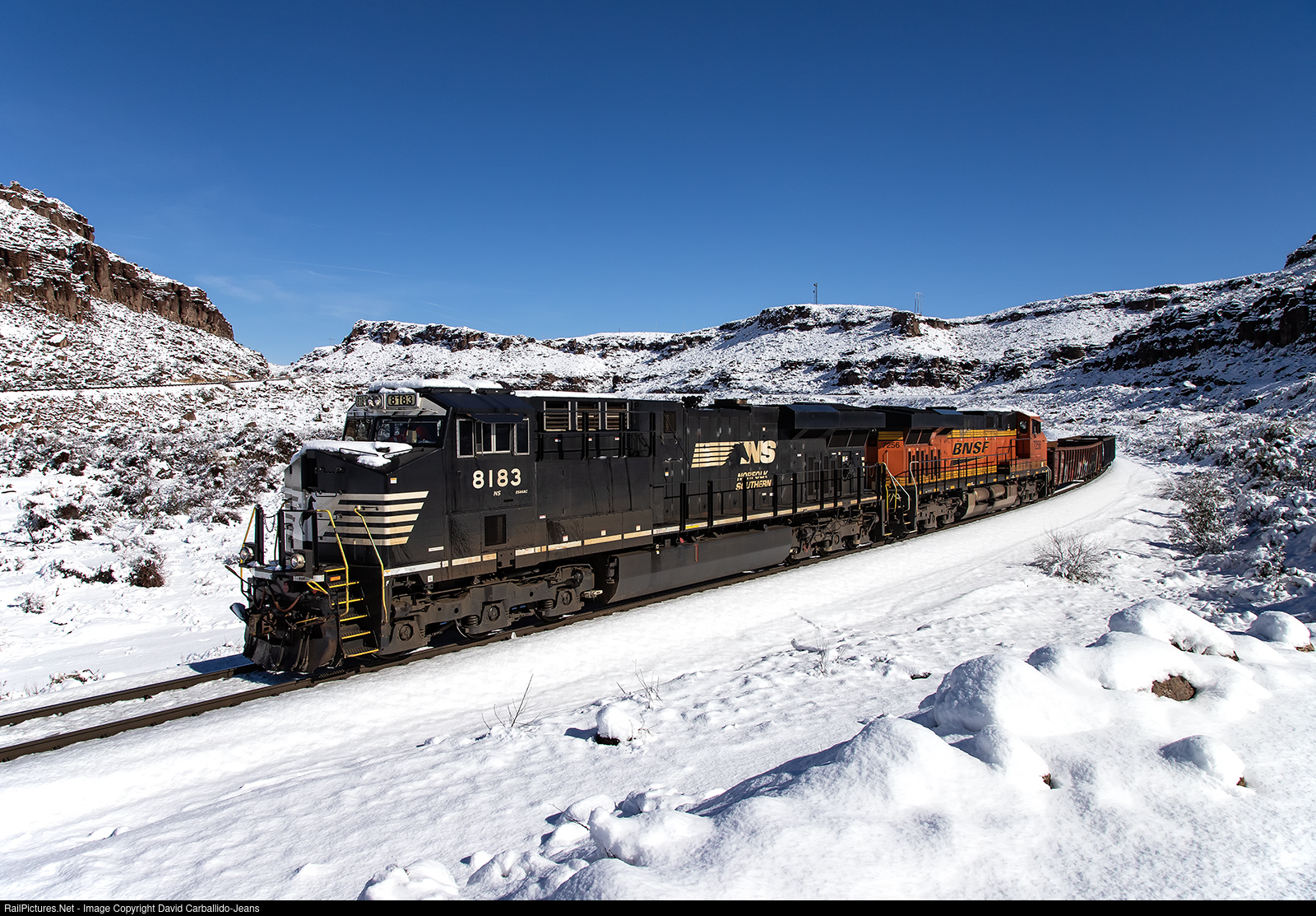 | A Norfolk Southern ES44AC leads a short two-car Kingman Local through Kingman Canyon as it heads to McConnico Steel Plant. Kingman received seven inches of snow the night before; blanketing the whole region in white. |