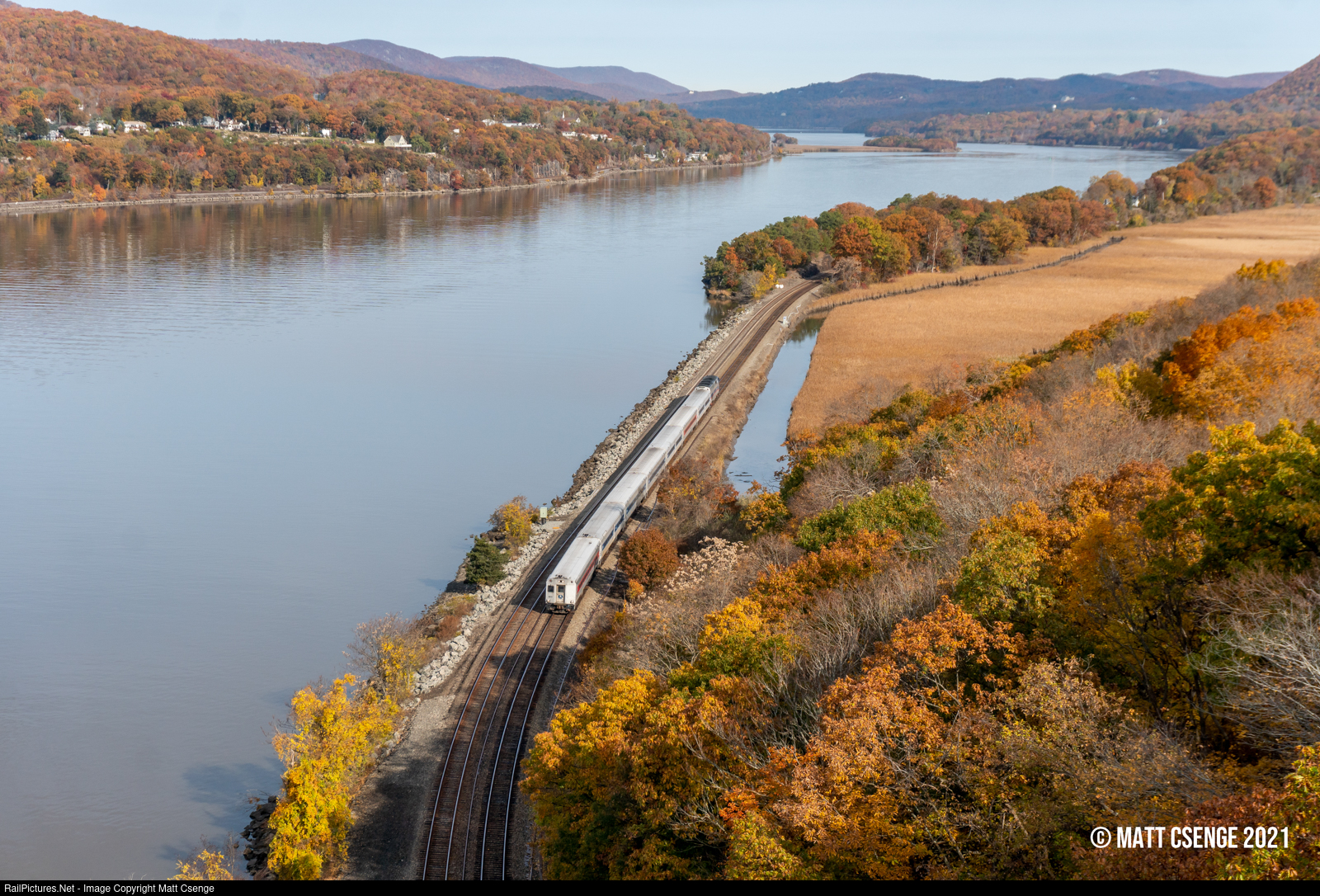 A southbound Hudson Line train with two cab cars leading (Shoreliner II no. 6211 is the lead car) is seen cruising along the namesake river, approaching the Bear Mountain Bridge. |