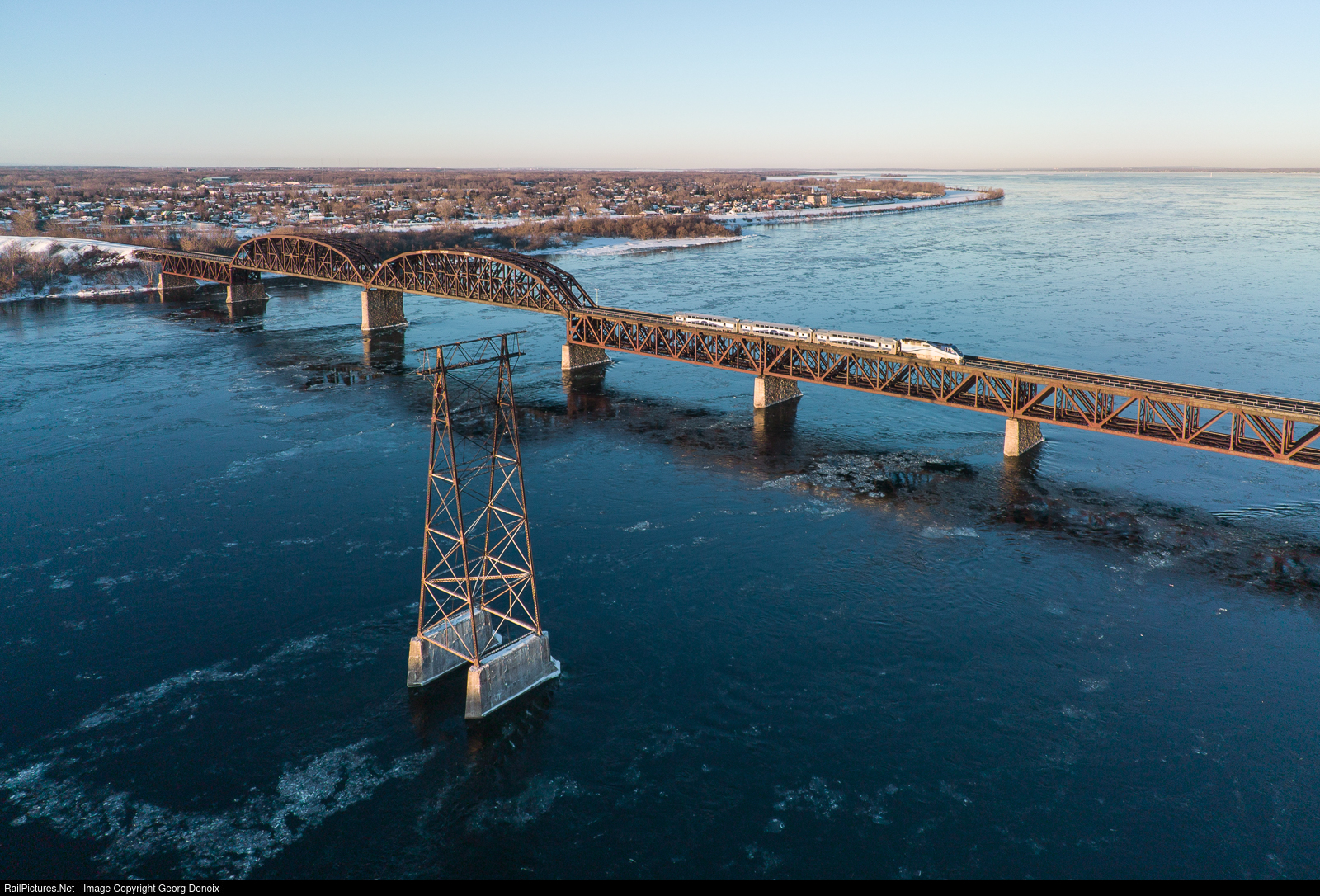 | After a cold night some ice is floating on the Saint-Lawrence river at LaSalle as EXO 72, pulled by F59PHI no. 1324, crosses over to the island of Montreal not too long after sunrise. |