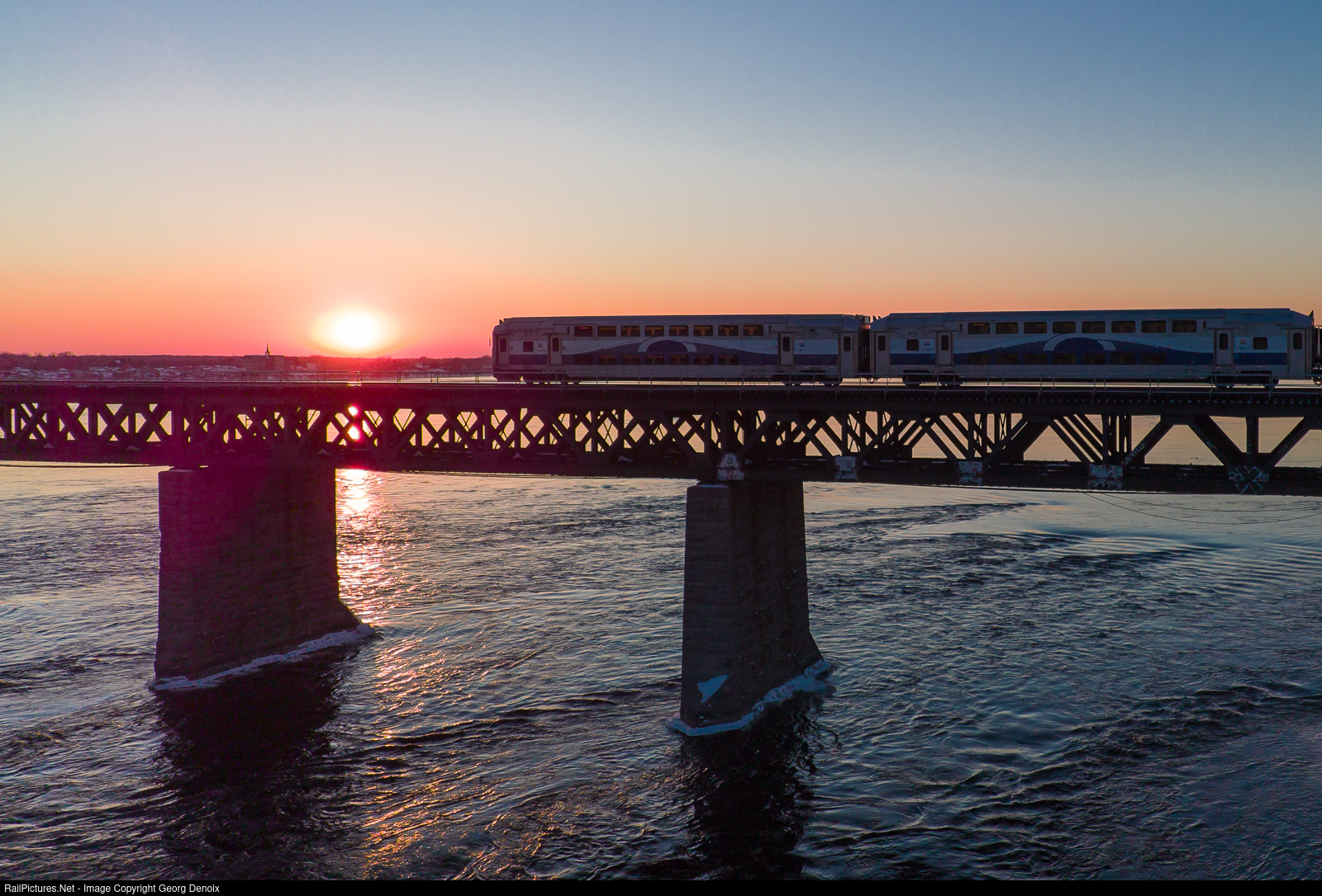 | The sun is setting over Kahnawake on the southern shore of the wide Saint Lawrence river just opposite to Lasalle, where deadheading EXO H90 is heading to make another run from Montreal's Lucien L'Allier terminus as EXO train no. 90. |