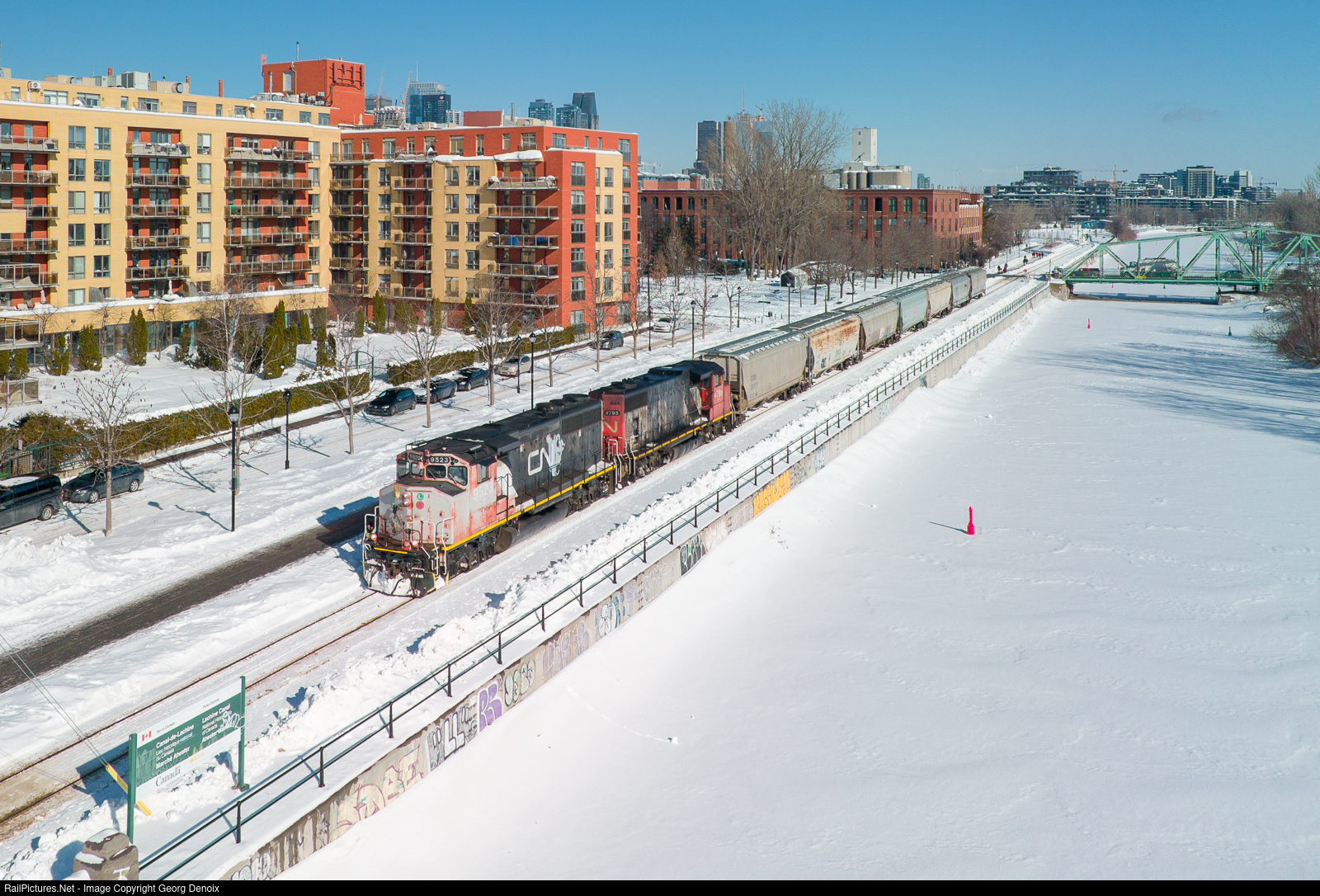 Service to Ardent Mills, last rail client on Montral's Lachine Canal bank, is a fragile business, constantly threatened to be handed over to the rubber-tired competition. At a time when service was provided by rail, a pair of CN GPs is lifting empties and heading back to the mainline.