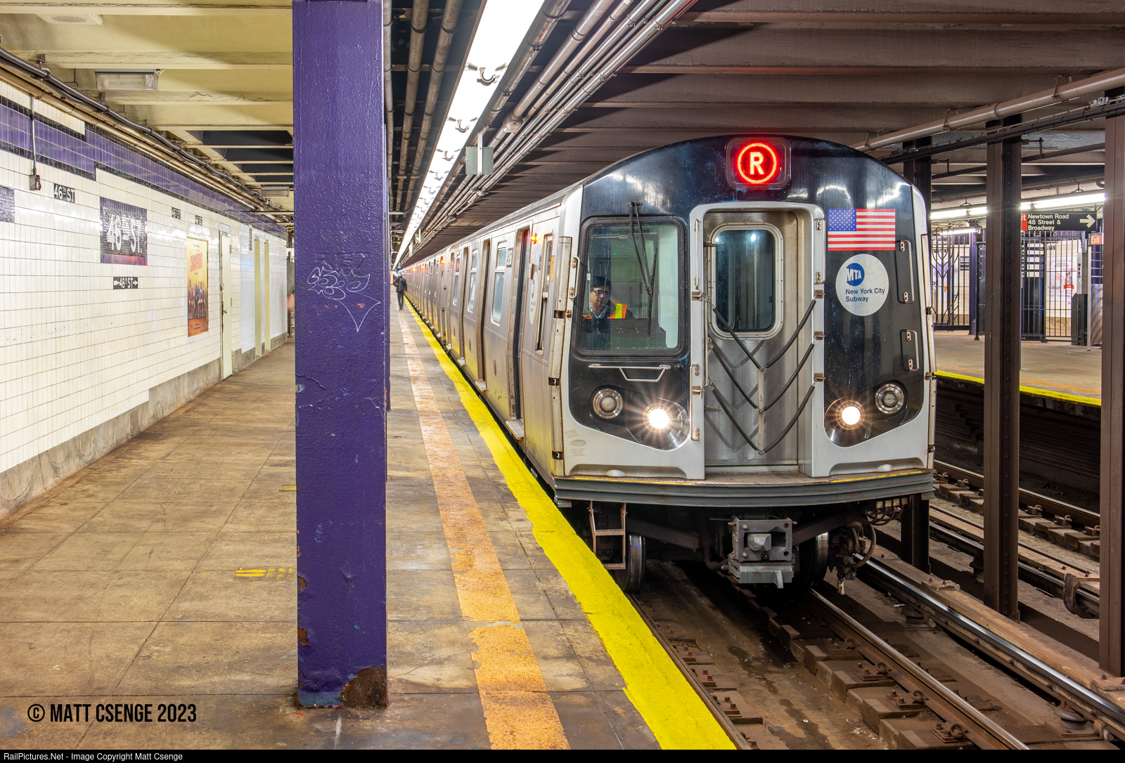 New York City Transit Authority (NYCTA) R160A no. 9268 (Alstom, 2005-2010) is the lead motor on a Forest Hills-bound R train seen stopped at 46th St Station on the IND Queens Boulevard Line. The R train runs underground on its long, 45-station local route from Forest Hills, Queens to Bay Ridge, Brooklyn, briefly surfacing for air where it crosses the LIRR Bay Ridge Branch (though this is still below the street on a two-level bridge).