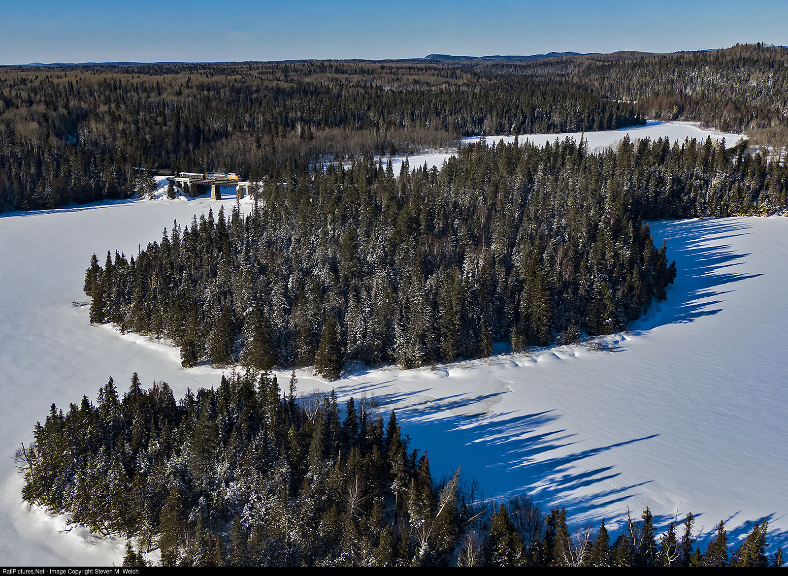 Nicknamed the “Burma Road” by train crews, Ontario Northland’s Kirkland Lake Subdivision doesn’t have a straight or flat mile. The Kirkland Lake Sub was built in the early 1900’s as a branch line by the Temiskaming and Northern Ontario Railway to connect Quebec to the mainline, that was serving mines rich with silver further south near Colbalt. Due to the line extending into Quebec, T&NO encountered hurdles trying to operate the line, and as a result, chartered the operations to the Nispissing Central Railway. But the NCR encountered hurdles too, and a jury ruled in favor of the railway to operate all the way to Rouyn-Noranda in 1926. The NCR still exists today, albeit on paper, but Ontario Northland is the main show. ONR operates a 6-day local out of Englehart to the CN interchange in Rouyn-Noranda, leaving Englehart shortly after lunch time and arriving in the French speaking province around sunset in the Winter months. It then returns back west and usually makes Englehart sometime before midnight. ONR train no 211 tiptoes across a curved bridge spanning the frozen Fork Lake with a solo SD75I and 22 cars.