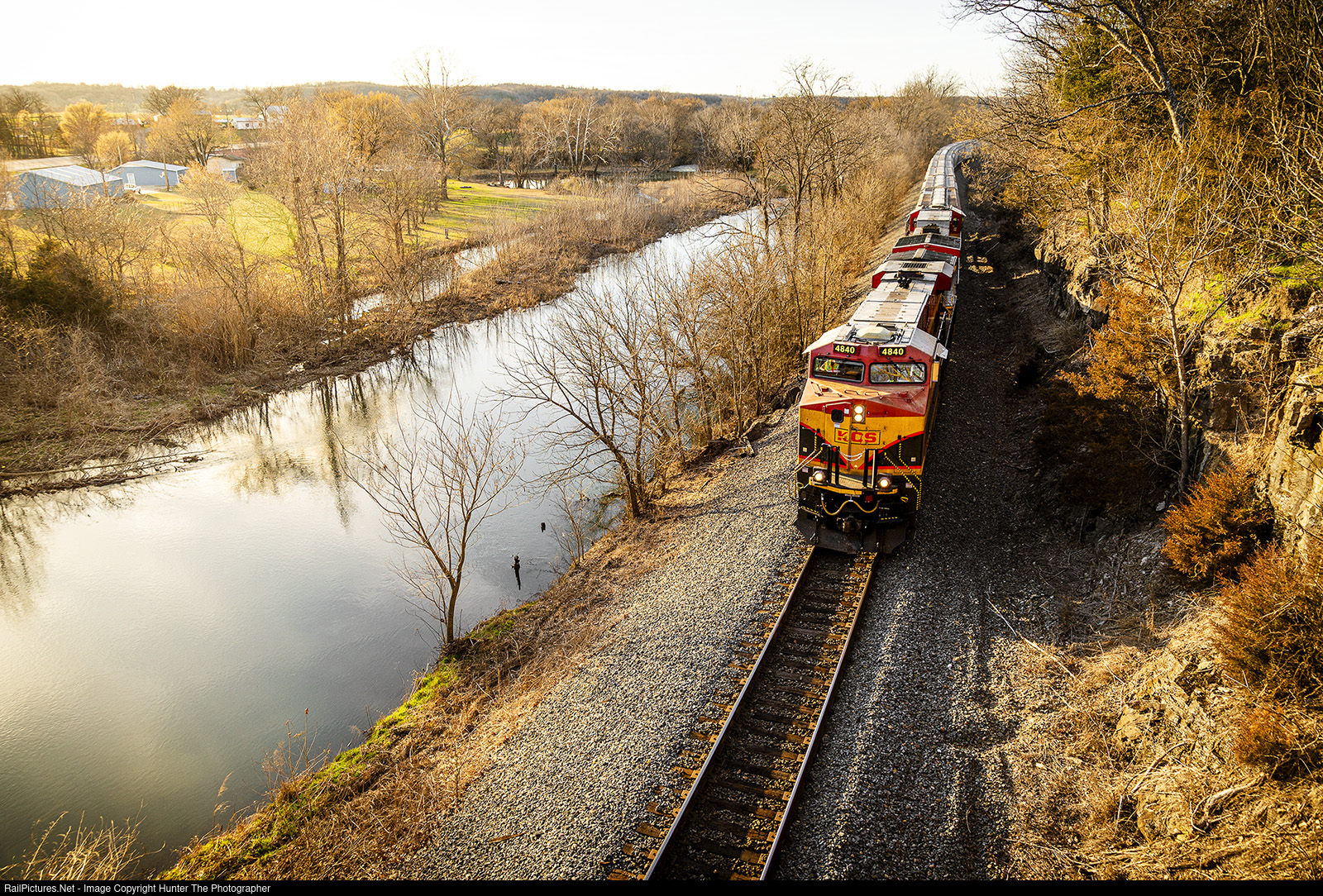 Late in the day on a sunny and warm Saturday, March 4, 2023, a pair of GE locomotives pull a southbound train of 93 loaded grain cars alongside a dammed section of Butler Creek, located just south of the Missouri state line near Sulphur Springs, Arkansas.