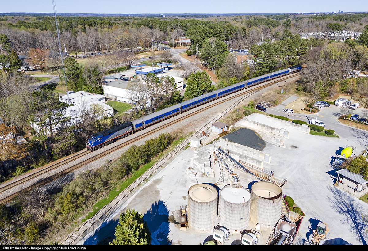 Amtrak 77 rounds the curve coming into Cary with a pair of F59PHs bracketing 5 cars for Charlotte.