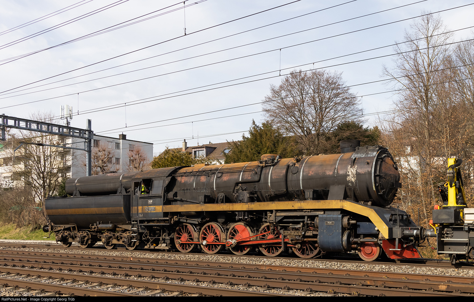 In the night 19/20 January 2023 there was a fire in the locomotive depot of the SBB in Schaffhausen. The building has been leased for many years to the company DLM (Dampflokomotiv- und Maschinenfabrik), which has a total of 4 steam locomotives stored there. In addition to three fireless 3-axle steamlocomotives, the large 2-10-0 locomotive 52 # 8055, which had been converted to light oil firing and extensively modernized by DLM, was also heavily damaged. On February 22, the locomotive was transported from Schaffhausen via Bülach-Winterthur to the Stauffer company in Frauenfeld, where refurbishment will take place. Re 421 # 383 of UTL (Umwelt und Transportlogistik) pulls the diesel tractor (shunting locomotive) Tm 232 # 026 of Stauffer and the steam locomotive 52 # 8055 between Winterthur and Oberwinterthur.