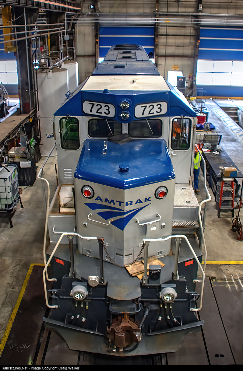 Amtrak GP38 723, getting some work done in the carrier's Wilmington Maintenance Facility, was built by General Motors Electro-Motive Division as Louisville & Nashville GP38 4003 in June 1970, this Geep later became Seaboard System 6224, and following yet another merger, CSX Transportation 2133. (Wilmington, Delaware – February 1, 2023) Photographed on railroad property with permission and full PPE, including the required safety harness to be up this high.