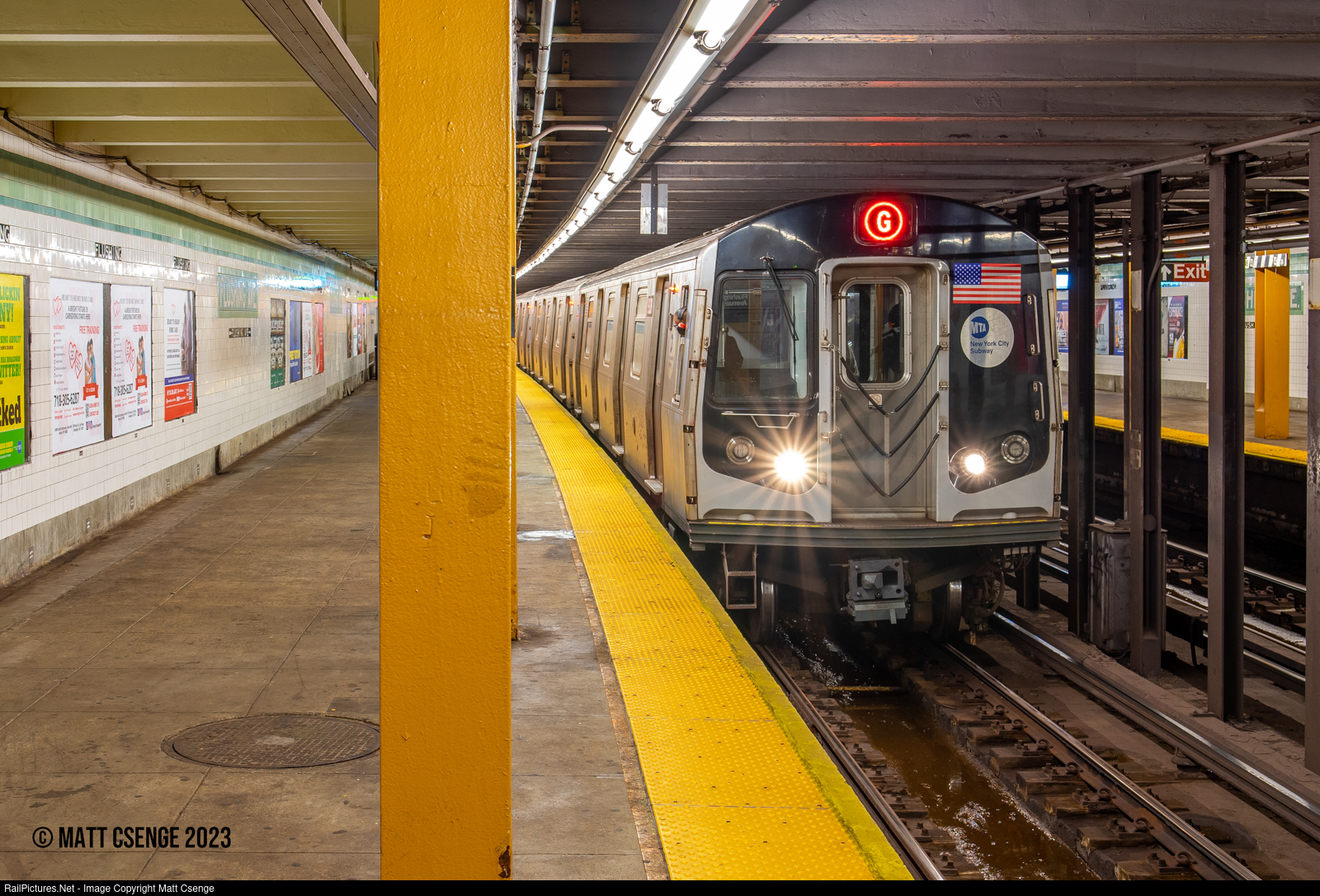 Flushing Local. New York City Transit Authority (NYCTA) R160B no. 9938 (Kawasaki, 2005-2010) is the lead motor on a Queens-bound G train seen stopped at Flushing Ave Station on the IND Crosstown Line.