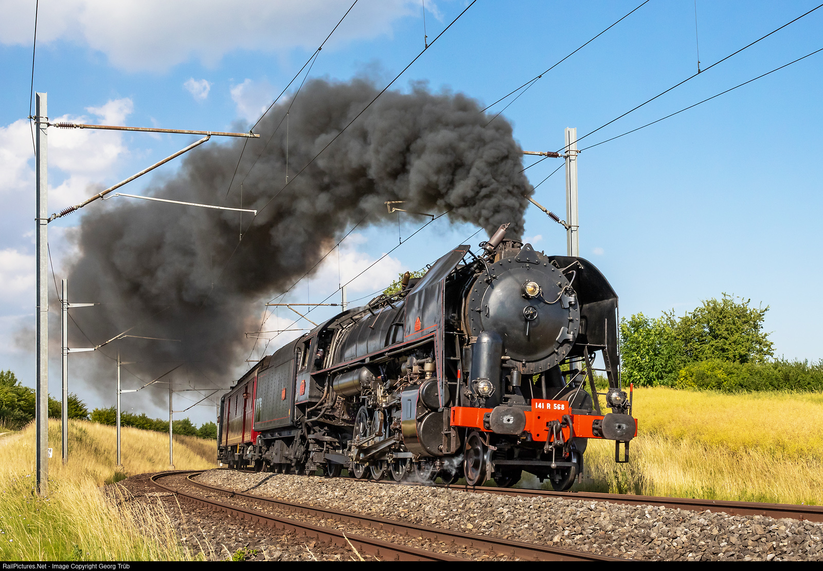 In 1945 built by Baldwin, former french railways SNCF, coalfired 2-8-2 "Mikado" steamlocomotive 141 R # 568 (owner Andrew Cook of Wiiliam Cook Rail) is now based at Vallorbe and operated by association 141R568. This day it made a nice roundtrip through western part of Switzerland, called "Lac Léman et campagne Vaudois" (Lake Geneva and landscape of canton Vaud). The route was from Vallorbe to Lausanne, through the vineyards up to Puidoux-Chexbres, to Romont-Fribourg-Payerne-Moudon-Palézieux-Lausanne back to Vallorbe. With a very impressive black smoke the stoker fired locomotive is running on the 2.0 % grade towards Vallorbe near Arnex. Note the Boxpok wheels on the driving axle only.