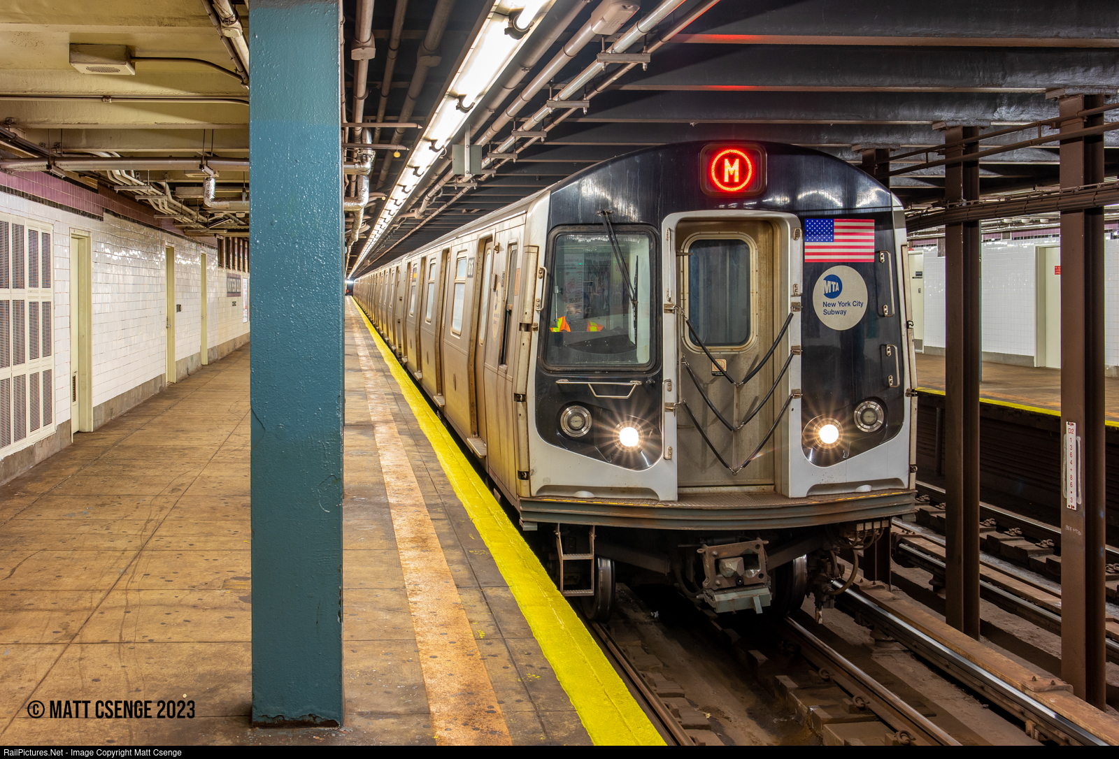 New York City Transit Authority (NYCTA) R160A no. 8616 (Alstom, 2005-2010) is the lead motor on a Forest Hills-bound M train seen stopped at Northern Blvd Station on the IND Queens Boulevard Line. |
