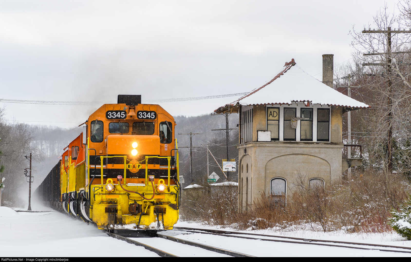 | The roar of EMD prime movers and the echo of the horn fills the valley as a Buffalo & Pittsburgh coal extra cruises north past the old BR&P AD Tower at Ashford, New York after a late season snow fall. The coal loads are bound for Buffalo for unloading and shipment by boat to the final destination. |