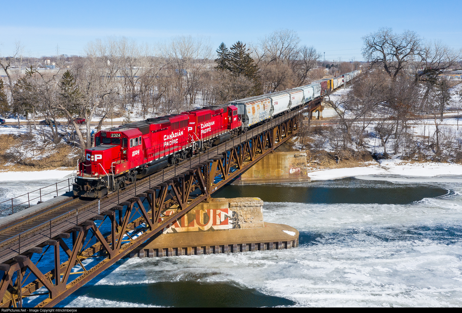 | Canadian Pacific's Shoreham Transfer Job H17 rolls west behind a pair of GP20C-ECO's as it crosses over the Mississippi River on the Paynesville Subdivision. The train is heading back towards Humboldt Yard after working Shoreham Yard on the east side of the river. |