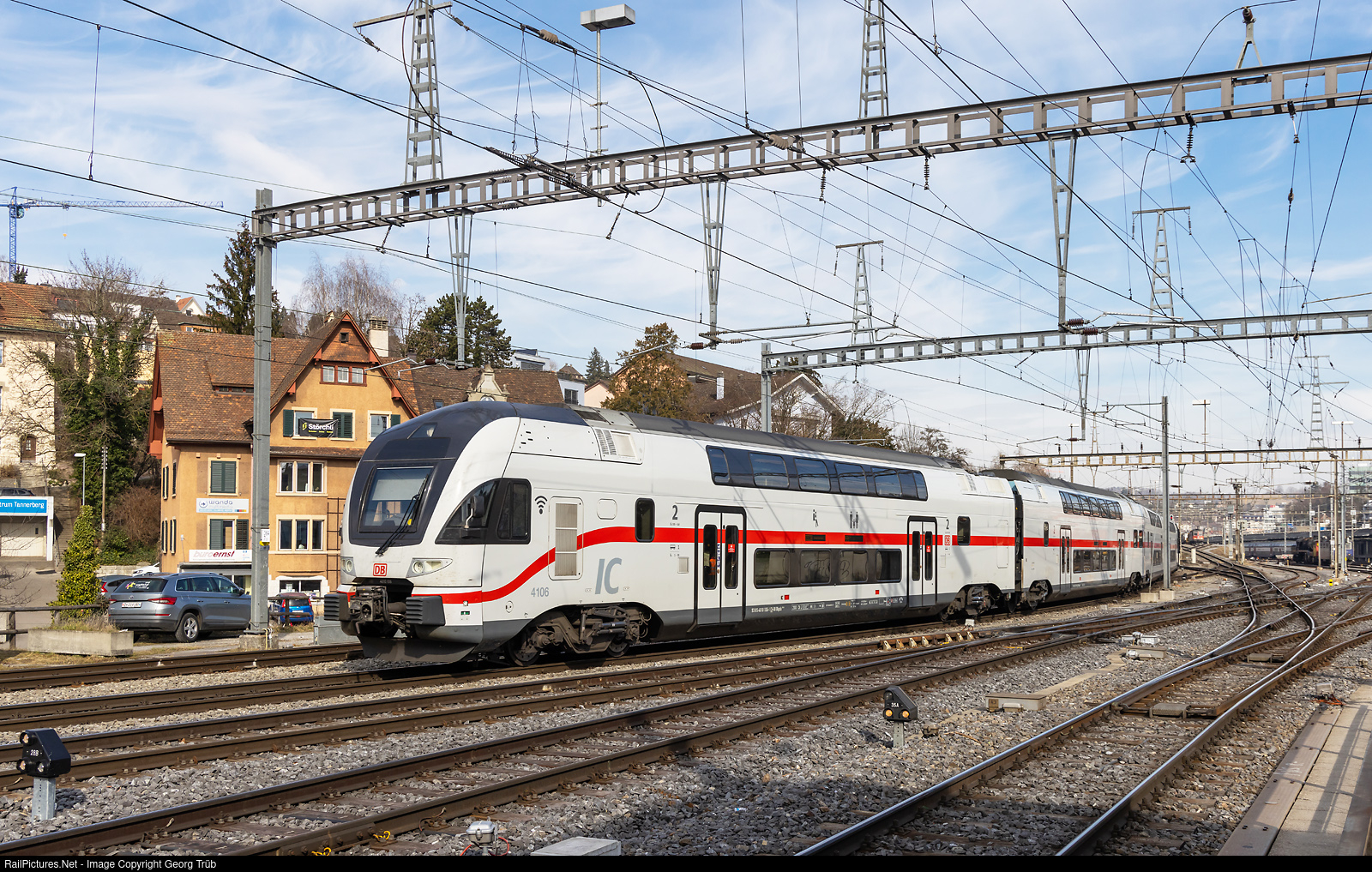 | The doubledeck Intercity train of type "IC2K", 4010 # 006 (4106) of the Deutsche Bahn AG is leaving Schaffhausen, running as IC 488 from Zürich via Singen (Hohentwiel)-Tuttlingen-Horb to Stuttgart. |