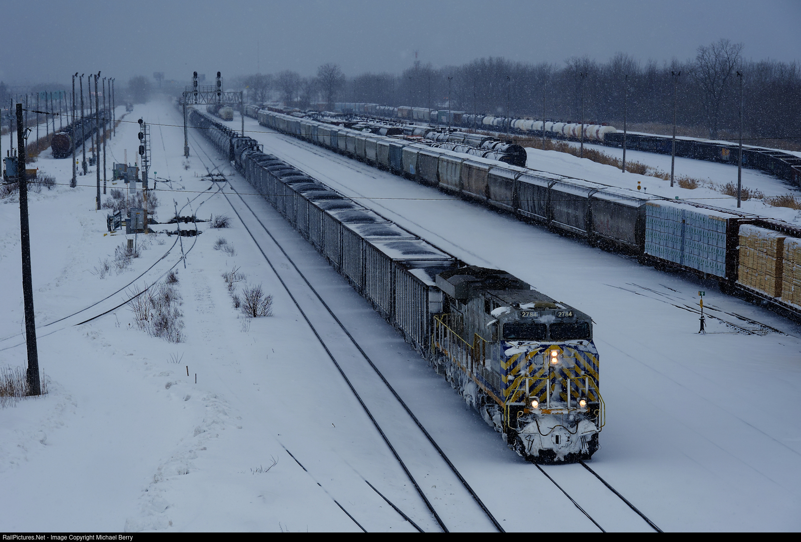 | Coal up front. CN X306 has an ex-CREX unit leading and another as DPU (CN 2784 & CN 3930) as it passes through Southwark Yard. Up front are about a dozen coal loads, an uncommon sight in Eastern Canada. They are taking the long way to Bécancour, as the cars will be set off at Joffre Yard, go back to Montreal on CN 401 and then finally go on CN 430 to Bécancour. |